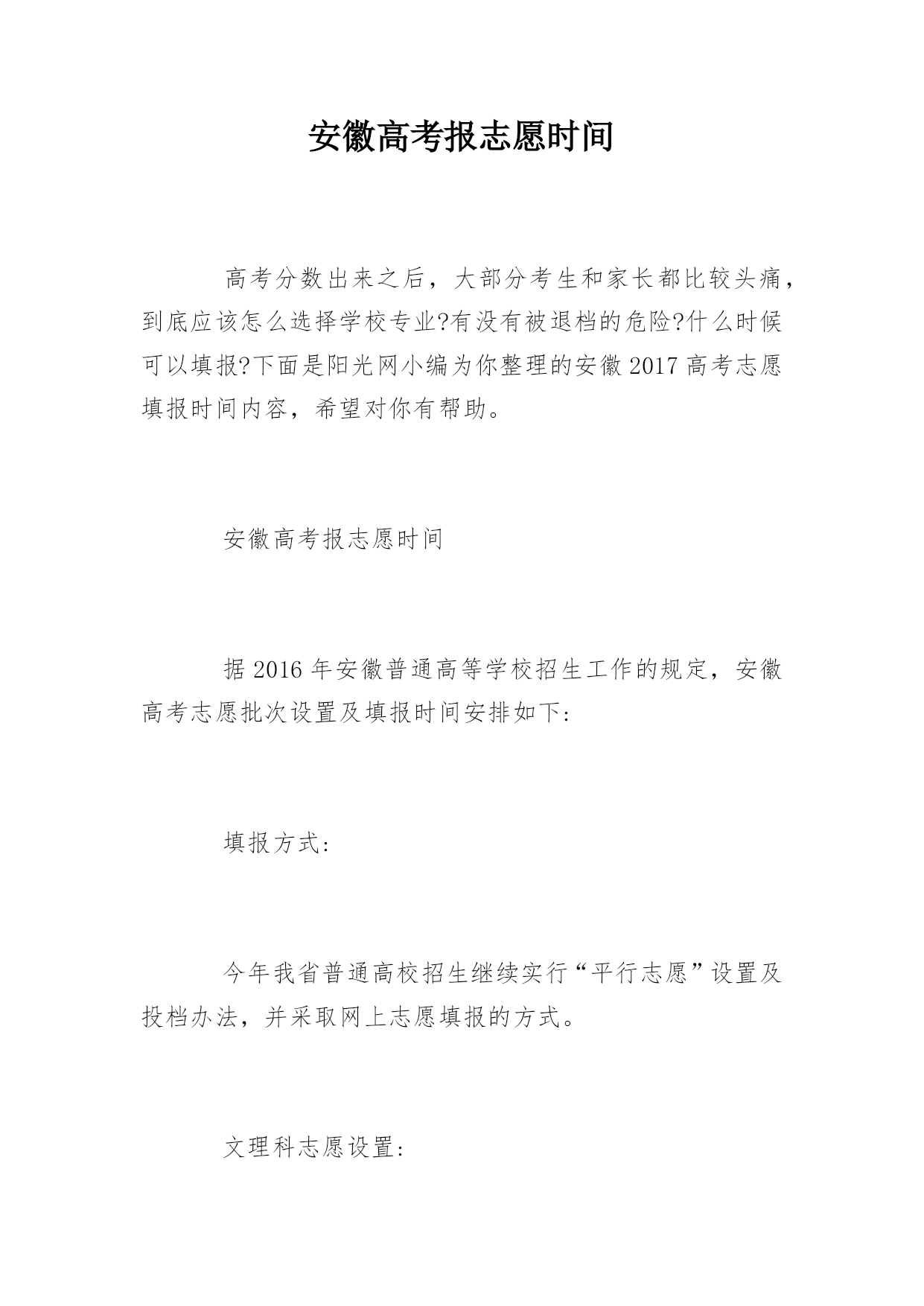 安徽高考报志愿时间高考分数出来之后,大部分考生和家长都比较头痛,到底应该怎么选择学校专业?有没有被退档的危险?什么时候可以填报?下面是阳光网小编为你整理的安徽2017高考志愿填报时间内容,希望对你有帮助。安徽高考报志愿时间据2016年安徽普通高等学校招生工作的规定,安徽高考志愿批次设置及填报时间安排如下:填报方式:今年我省普通高校招生继续实行“平行志愿”设置及投档办法,并采取网上志愿填报的方式。文理科志愿设置:文理科录取分本科提前批、高职(专科)提前批、本科第一批、本科第二批、本科第三批、高职(专科)批,