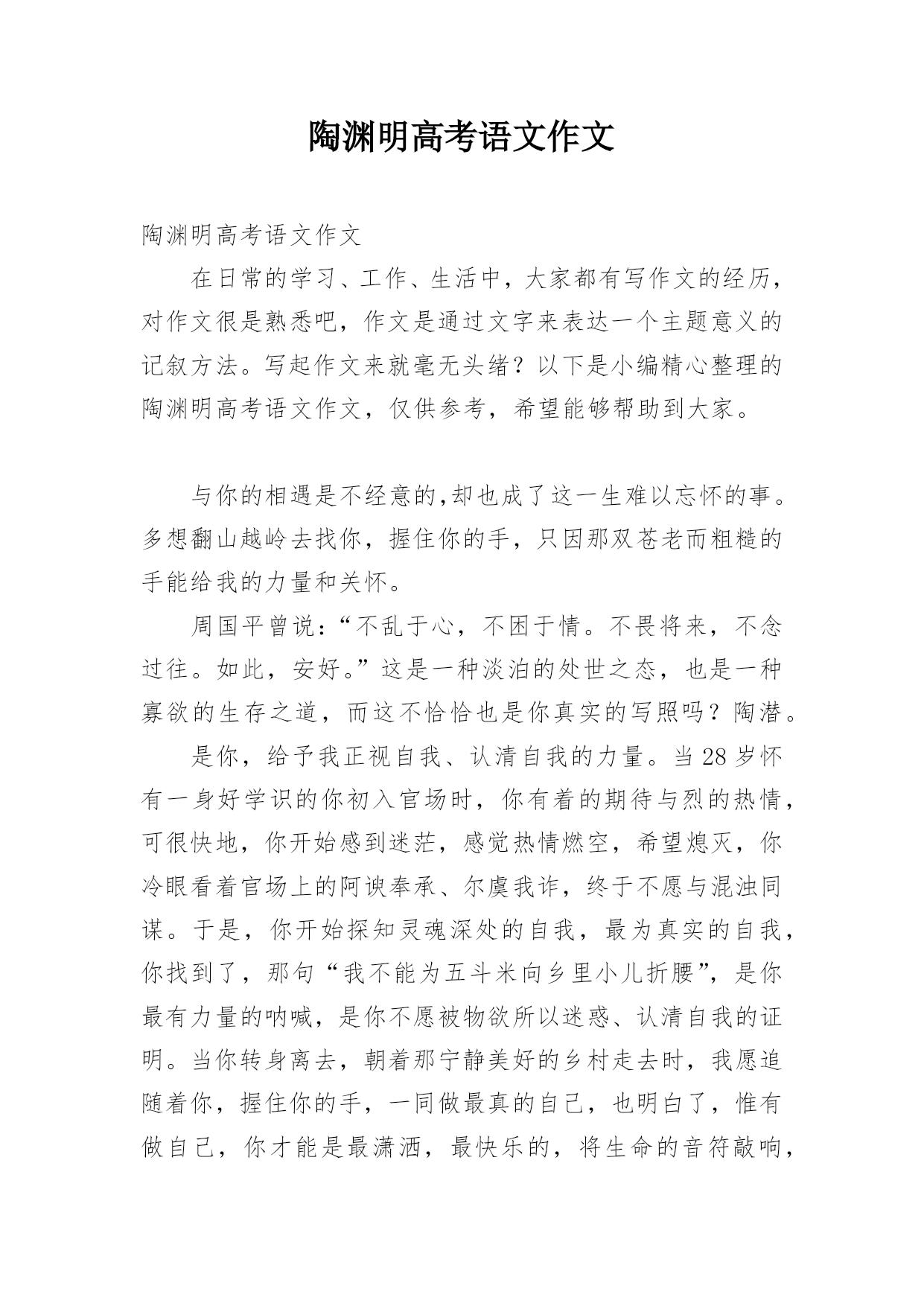 陶渊明高考语文作文陶渊明高考语文作文在日常的学习、工作、生活中,大家都有写作文的经历,对作文很是熟悉吧,作文是通过文字来表达一个主题意义的记叙方法。写起作文来就毫无头绪?以下是小编精心整理的陶渊明高考语文作文,仅供参考,希望能够帮助到大家。与你的相遇是不经意的,却也成了这一生难以忘怀的事。多想翻山越岭去找你,握住你的手,只因那双苍老而粗糙的手能给我的力量和关怀。周国平曾说:“不乱于心,不困于情。不畏将来,不念过往。如此,安好。”这是一种淡泊的处世之态,也是一种寡欲的生存之道,而这不恰恰也是你真实的写照吗?