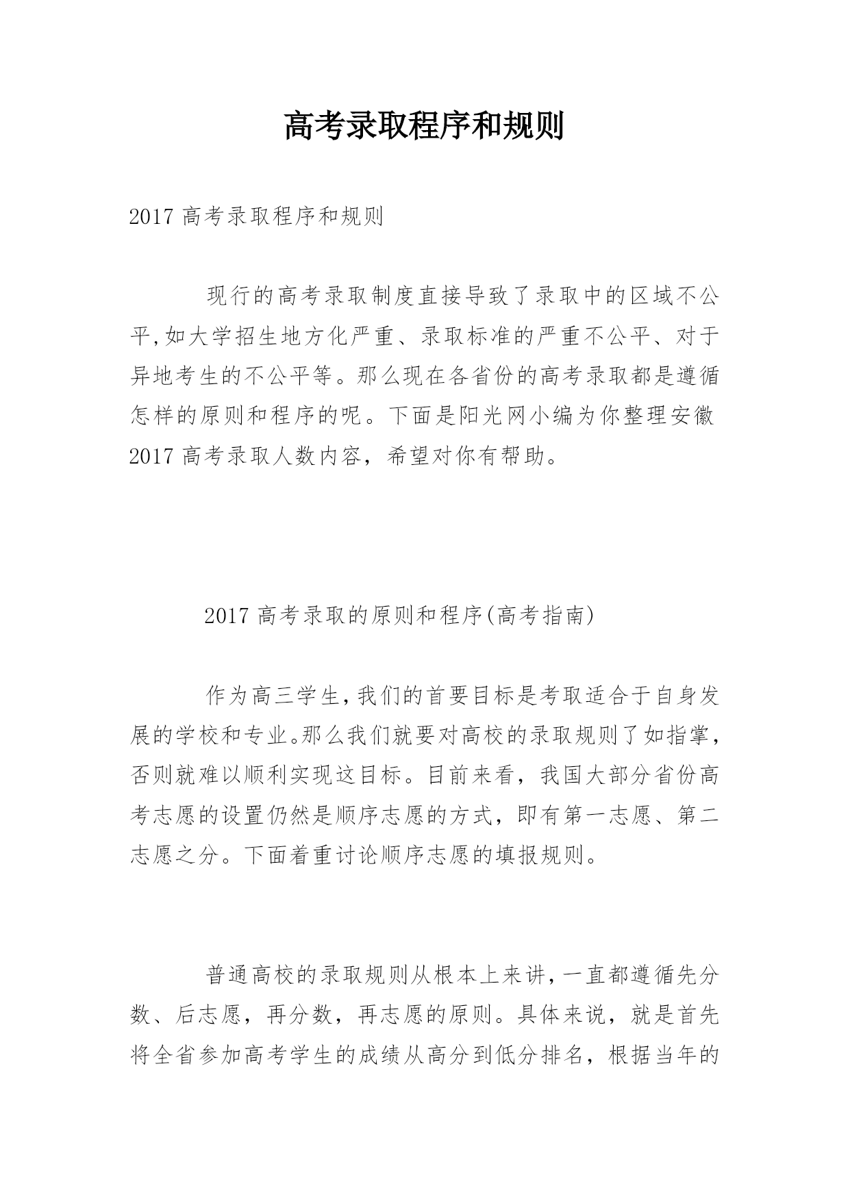高考录取程序和规则2017高考录取程序和规则现行的高考录取制度直接导致了录取中的区域不公平,如大学招生地方化严重、录取标准的严重不公平、对于异地考生的不公平等。那么现在各省份的高考录取都是遵循怎样的原则和程序的呢。下面是阳光网小编为你整理安徽2017高考录取人数内容,希望对你有帮助。2017高考录取的原则和程序(高考指南)作为高三学生,我们的首要目标是考取适合于自身发展的学校和专业。那么我们就要对高校的录取规则了如指掌,否则就难以顺利实现这目标。目前来看,我国大部分省份高考志愿的设置仍然是顺序志愿的方式,