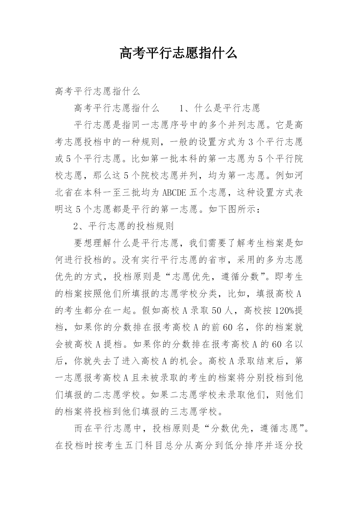 高考平行志愿指什么高考平行志愿指什么高考平行志愿指什么1、什么是平行志愿平行志愿是指同一志愿序号中的多个并列志愿。它是高考志愿投档中的一种规则,一般的设置方式为3个平行志愿或5个平行志愿。比如第一批本科的第一志愿为5个平行院校志愿,那么这5个院校志愿并列,均为第一志愿。例如河北省在本科一至三批均为ABCDE五个志愿,这种设置方式表明这5个志愿都是平行的第一志愿。如下图所示:2、平行志愿的投档规则要想理解什么是平行志愿,我们需要了解考生档案是如何进行投档的。没有实行平行志愿的省市,采用的多为志愿优先的方式,