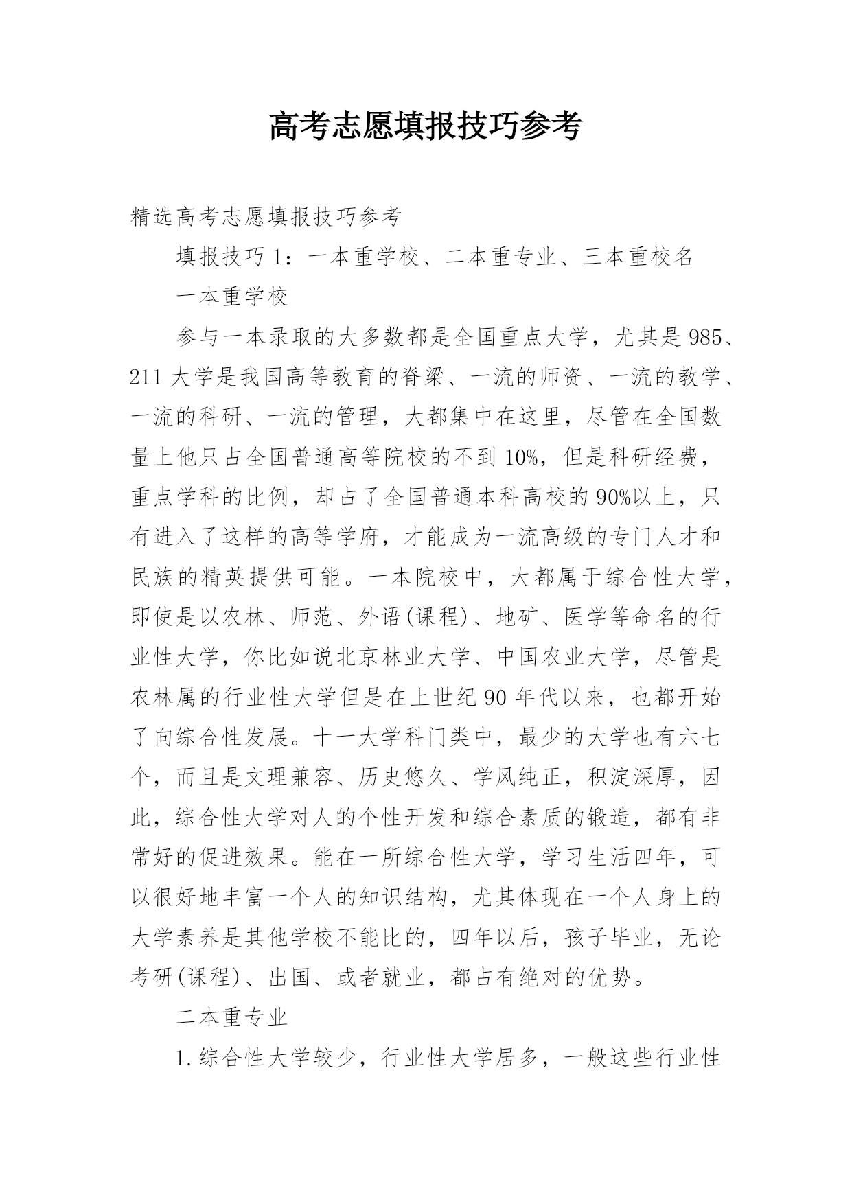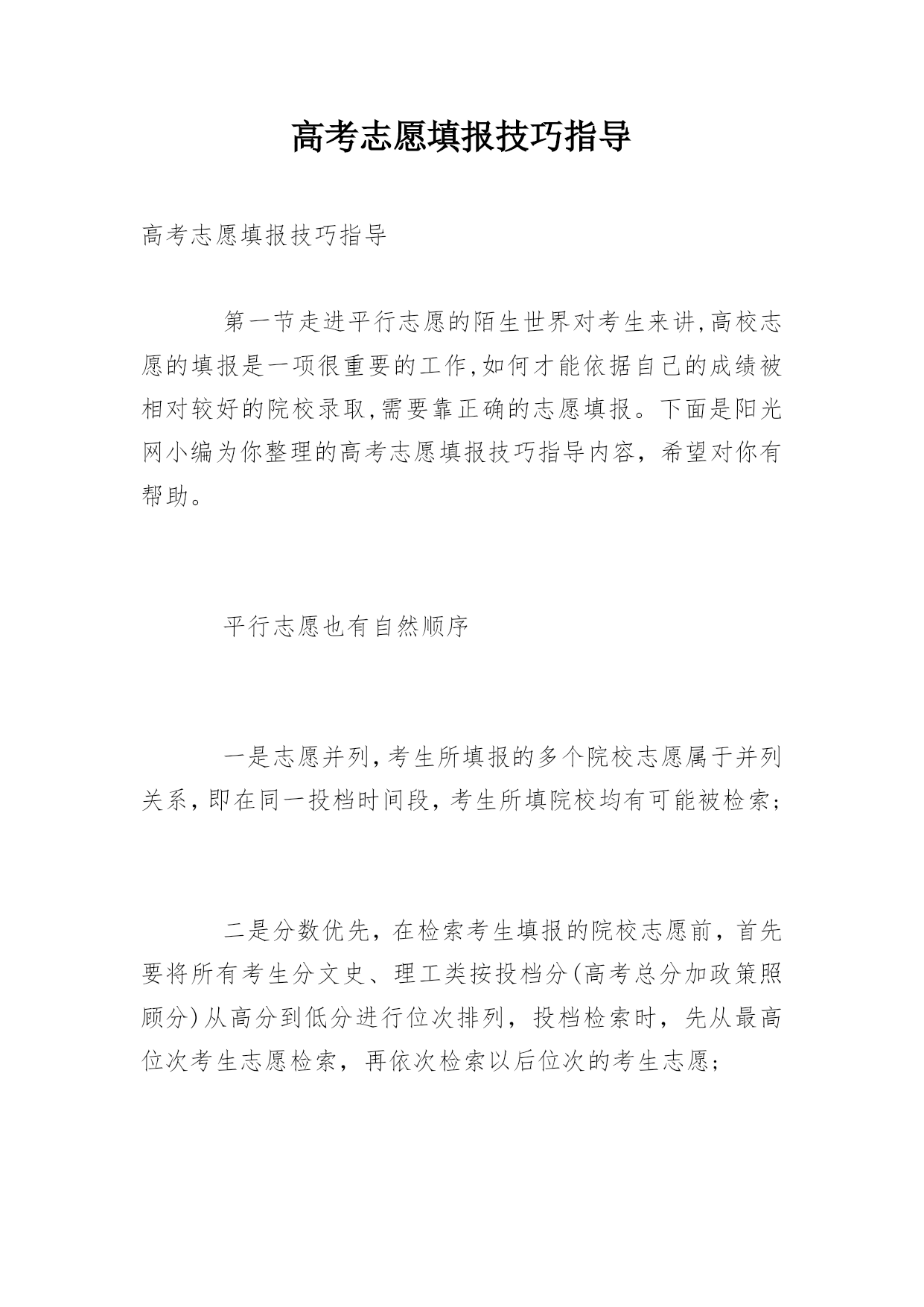 高考志愿填报技巧指导高考志愿填报技巧指导第一节走进平行志愿的陌生世界对考生来讲,高校志愿的填报是一项很重要的工作,如何才能依据自己的成绩被相对较好的院校录取,需要靠正确的志愿填报。下面是阳光网小编为你整理的高考志愿填报技巧指导内容,希望对你有帮助。平行志愿也有自然顺序一是志愿并列,考生所填报的多个院校志愿属于并列关系,即在同一投档时间段,考生所填院校均有可能被检索;二是分数优先,在检索考生填报的院校志愿前,首先要将所有考生分文史、理工类按投档分(高考总分加政策照顾分)从高分到低分进行位次排列,投档检索时,