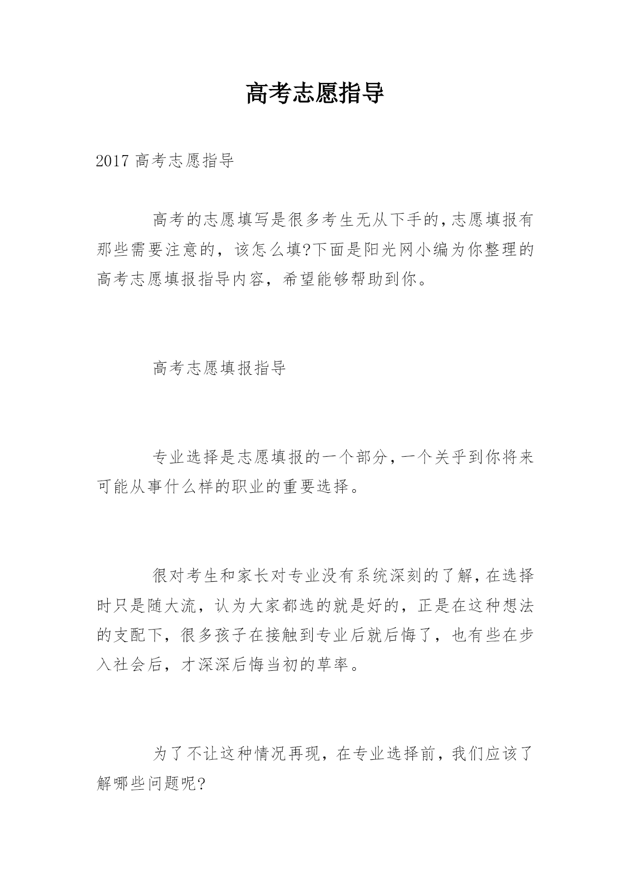 高考志愿指导2017高考志愿指导高考的志愿填写是很多考生无从下手的,志愿填报有那些需要注意的,该怎么填?下面是阳光网小编为你整理的高考志愿填报指导内容,希望能够帮助到你。高考志愿填报指导专业选择是志愿填报的一个部分,一个关乎到你将来可能从事什么样的职业的重要选择。很对考生和家长对专业没有系统深刻的了解,在选择时只是随大流,认为大家都选的就是好的,正是在这种想法的支配下,很多孩子在接触到专业后就后悔了,也有些在步入社会后,才深深后悔当初的草率。为了不让这种情况再现,在专业选择前,我们应该了解哪些问题呢?性格