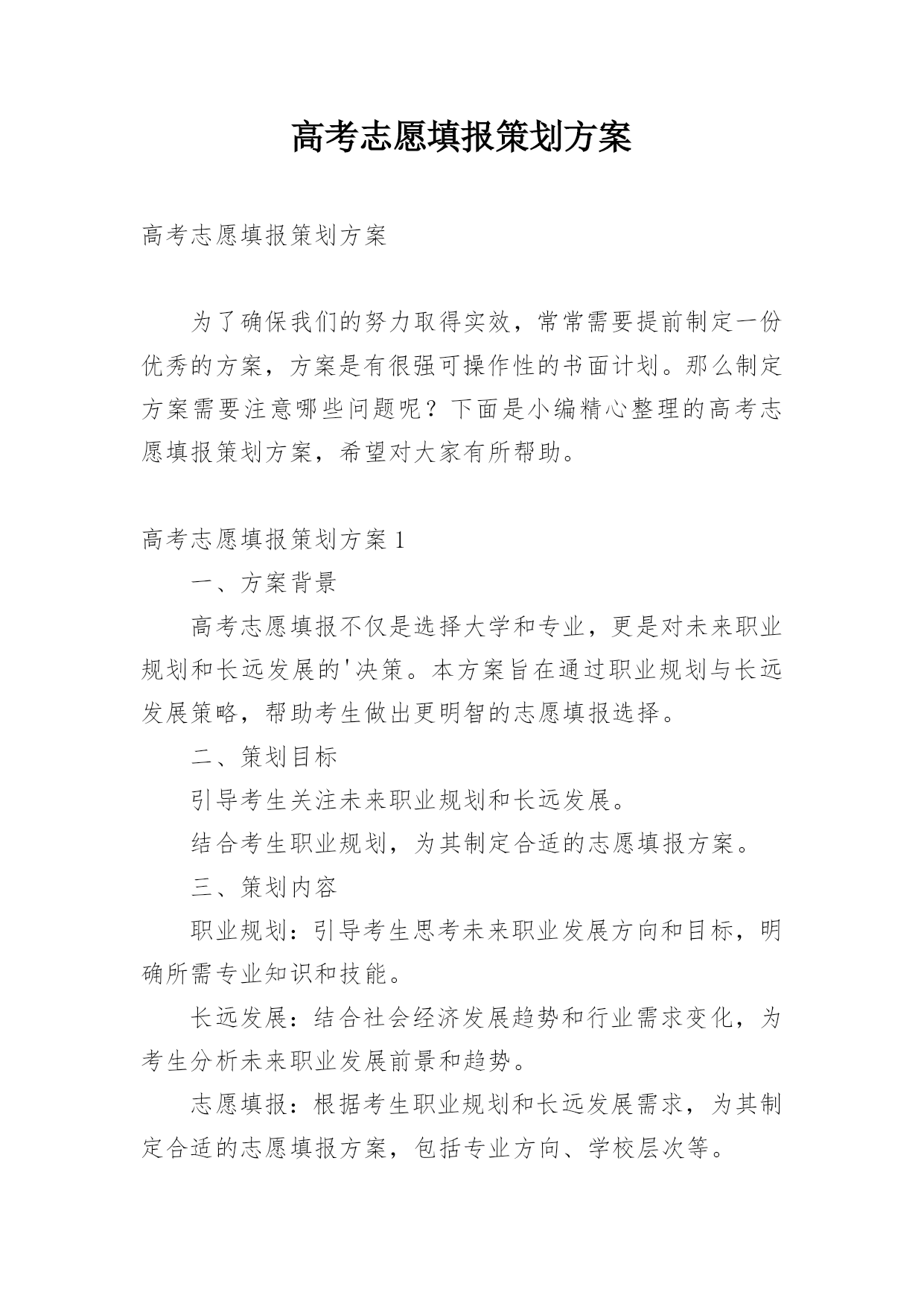 高考志愿填报策划方案高考志愿填报策划方案为了确保我们的努力取得实效,常常需要提前制定一份优秀的方案,方案是有很强可操作性的书面计划。那么制定方案需要注意哪些问题呢?下面是小编精心整理的高考志愿填报策划方案,希望对大家有所帮助。高考志愿填报策划方案1一、方案背景高考志愿填报不仅是选择大学和专业,更是对未来职业规划和长远发展的'决策。本方案旨在通过职业规划与长远发展策略,帮助考生做出更明智的志愿填报选择。二、策划目标引导考生关注未来职业规划和长远发展。结合考生职业规划,为其制定合适的志愿填报方案。三、策划内容