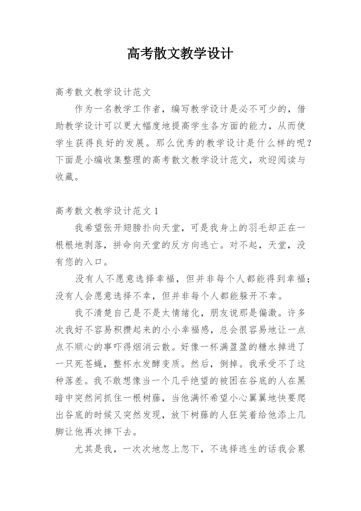 高考散文教学设计高考散文教学设计范文作为一名教学工作者,编写教学设计是必不可少的,借助教学设计可以更大幅度地提高学生各方面的能力,从而使学生获得良好的发展。那么优秀的教学设计是什么样的呢?下面是小编收集整理的高考散文教学设计范文,欢迎阅读与收藏。高考散文教学设计范文1我希望张开翅膀扑向天堂,可是我身上的羽毛却正在一根根地剥落,拼命向天堂的反方向逃亡。对不起,天堂,没有您的入口。没有人不愿意选择幸福,但并非每个人都能得到幸福;没有人会愿意选择不幸,但并非每个人都能躲开不幸。我不清楚自己是不是太情绪化,朋友说
