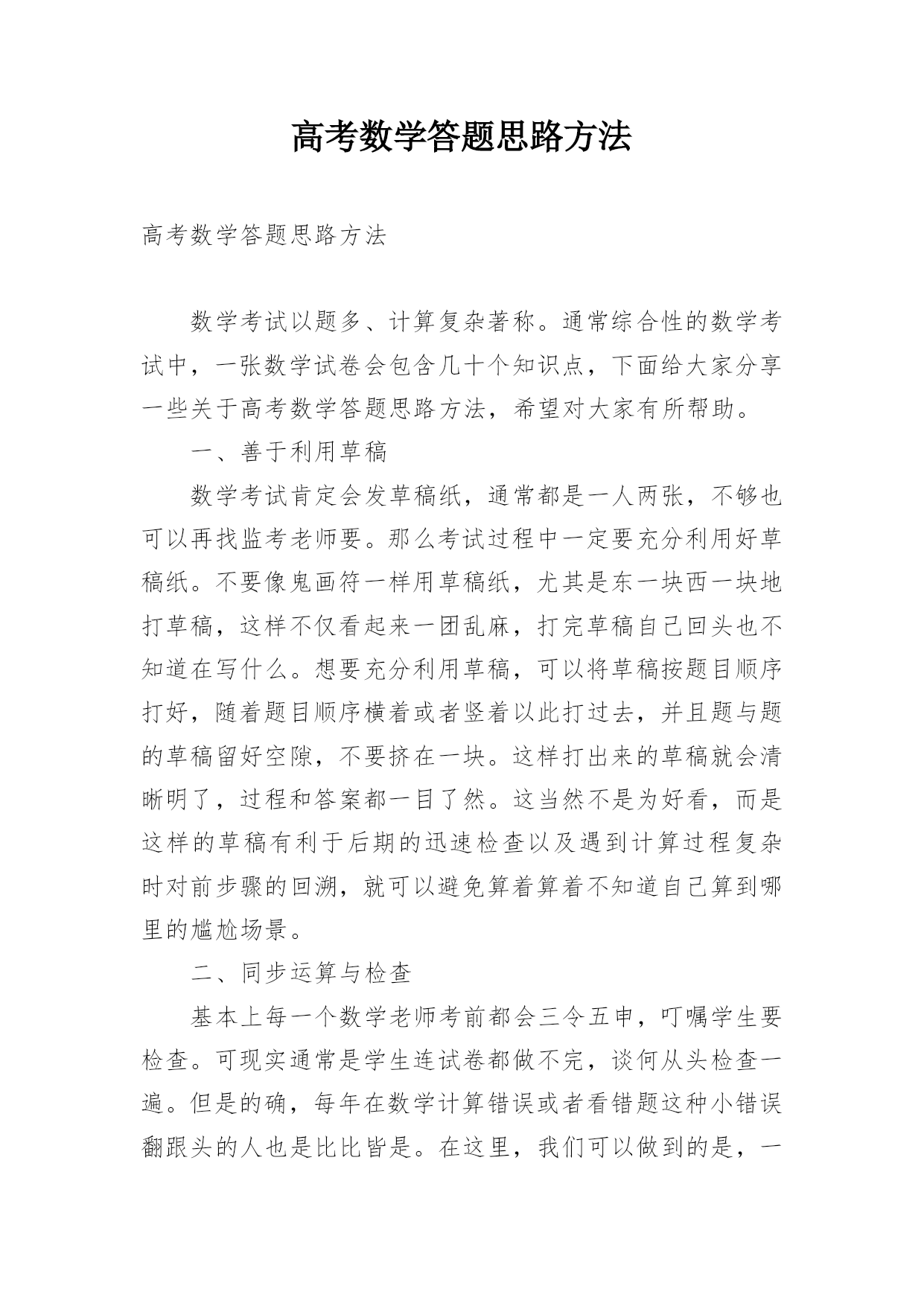 高考数学答题思路方法高考数学答题思路方法数学考试以题多、计算复杂著称。通常综合性的数学考试中,一张数学试卷会包含几十个知识点,下面给大家分享一些关于高考数学答题思路方法,希望对大家有所帮助。一、善于利用草稿数学考试肯定会发草稿纸,通常都是一人两张,不够也可以再找监考老师要。那么考试过程中一定要充分利用好草稿纸。不要像鬼画符一样用草稿纸,尤其是东一块西一块地打草稿,这样不仅看起来一团乱麻,打完草稿自己回头也不知道在写什么。想要充分利用草稿,可以将草稿按题目顺序打好,随着题目顺序横着或者竖着以此打过去,并且题