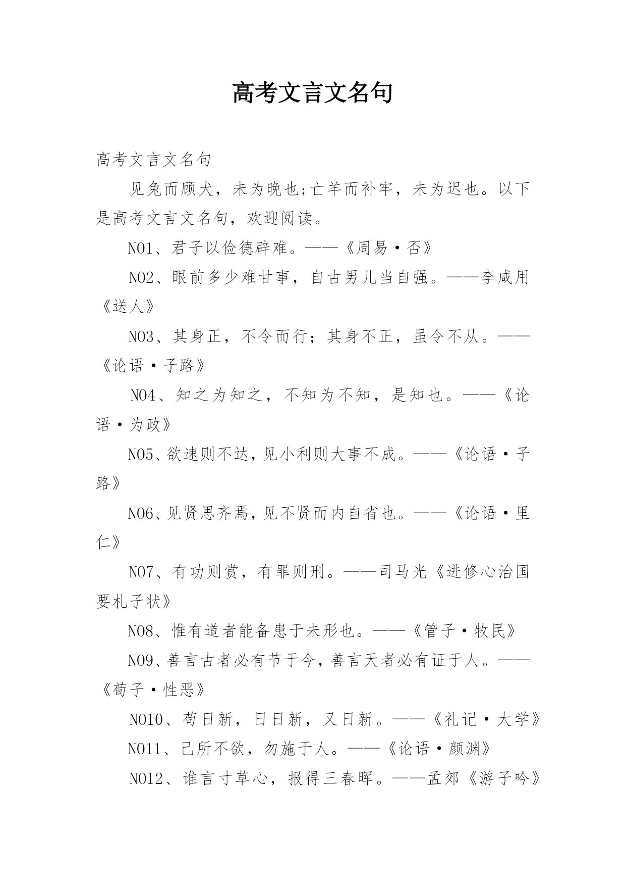 高考文言文名句高考文言文名句见兔而顾犬,未为晚也;亡羊而补牢,未为迟也。以下是高考文言文名句,欢迎阅读。NO1、君子以俭德辟难。——《周易·否》NO2、眼前多少难甘事,自古男儿当自强。——李咸用《送人》NO3、其身正,不令而行;其身不正,虽令不从。——《论语·子路》NO4、知之为知之,不知为不知,是知也。——《论语·为政》NO5、欲速则不达,见小利则大事不成。——《论语·子路》NO6、见贤思齐焉,见不贤而内自省也。——《论语·里仁》NO7、有功则赏,有罪则刑。——司马光《进修心治国要札子状》NO8、惟有道