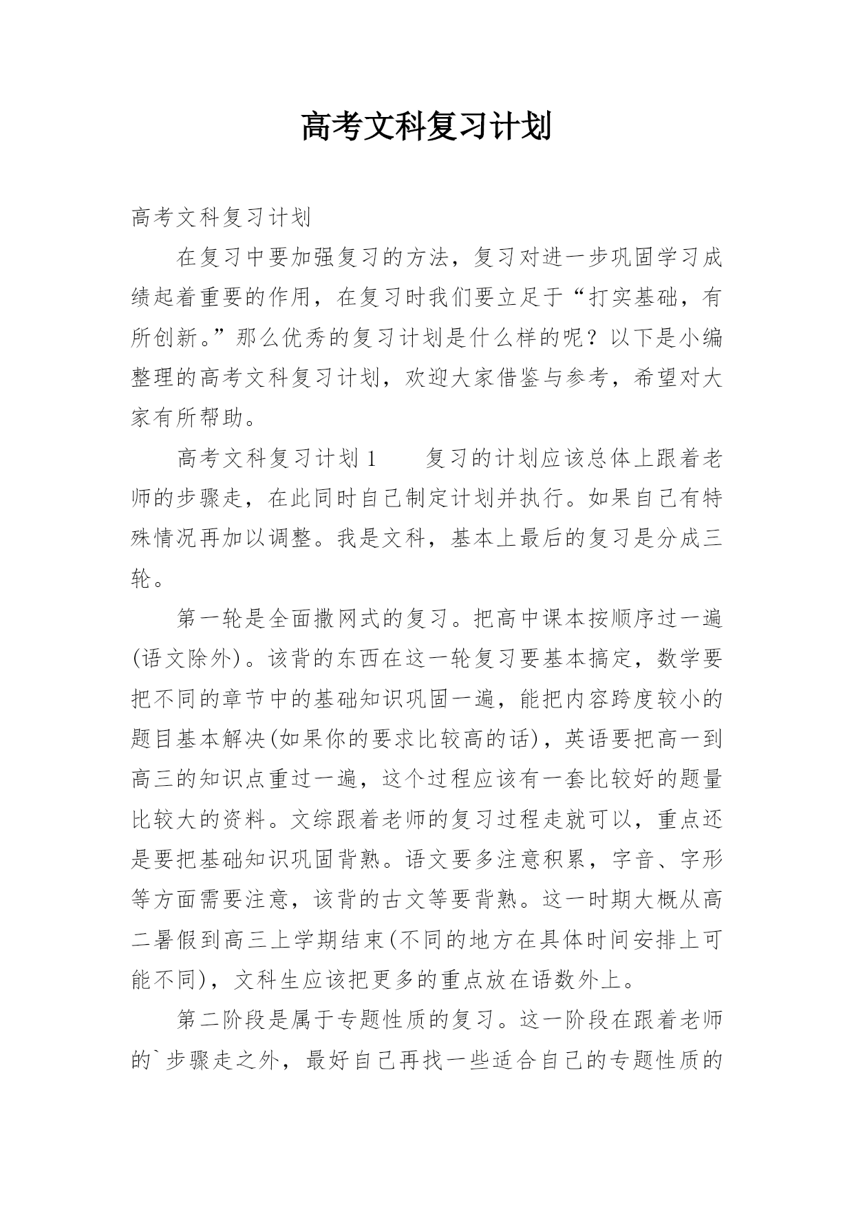 高考文科复习计划高考文科复习计划在复习中要加强复习的方法,复习对进一步巩固学习成绩起着重要的作用,在复习时我们要立足于“打实基础,有所创新。”那么优秀的复习计划是什么样的呢?以下是小编整理的高考文科复习计划,欢迎大家借鉴与参考,希望对大家有所帮助。高考文科复习计划1复习的计划应该总体上跟着老师的步骤走,在此同时自己制定计划并执行。如果自己有特殊情况再加以调整。我是文科,基本上最后的复习是分成三轮。第一轮是全面撒网式的复习。把高中课本按顺序过一遍(语文除外)。该背的东西在这一轮复习要基本搞定,数学要把不同的