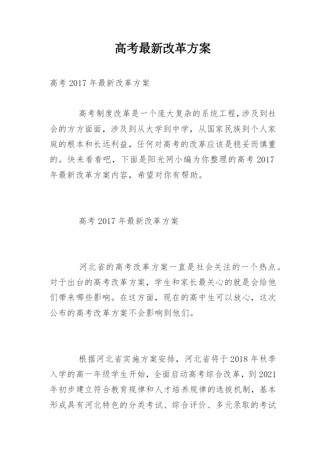 高考最新改革方案高考2017年最新改革方案高考制度改革是一个庞大复杂的系统工程,涉及到社会的方方面面,涉及到从大学到中学,从国家民族到个人家庭的根本和长远利益,任何对高考的改革应该是稳妥而慎重的。快来看看吧,下面是阳光网小编为你整理的高考2017年最新改革方案内容,希望对你有帮助。高考2017年最新改革方案河北省的高考改革方案一直是社会关注的一个热点。对于出台的高考改革方案,学生和家长最关心的就是会给他们带来哪些影响。在这方面,现在的高中生可以放心,这次公布的高考改革方案不会影响到他们。根据河北省实施方案