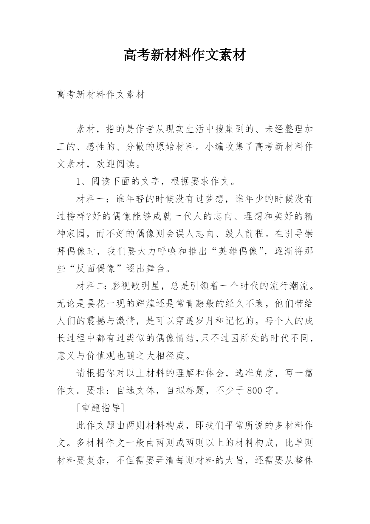 高考新材料作文素材高考新材料作文素材素材,指的是作者从现实生活中搜集到的、未经整理加工的、感性的、分散的原始材料。小编收集了高考新材料作文素材,欢迎阅读。1、阅读下面的文字,根据要求作文。材料一:谁年轻的时候没有过梦想,谁年少的时候没有过榜样?好的偶像能够成就一代人的志向、理想和美好的精神家园,而不好的偶像则会误人志向、毁人前程。在引导崇拜偶像时,我们要大力呼唤和推出“英雄偶像”,逐渐将那些“反面偶像”逐出舞台。材料二:影视歌明星,总是引领着一个时代的流行潮流。无论是昙花一现的辉煌还是常青藤般的经久不衰,