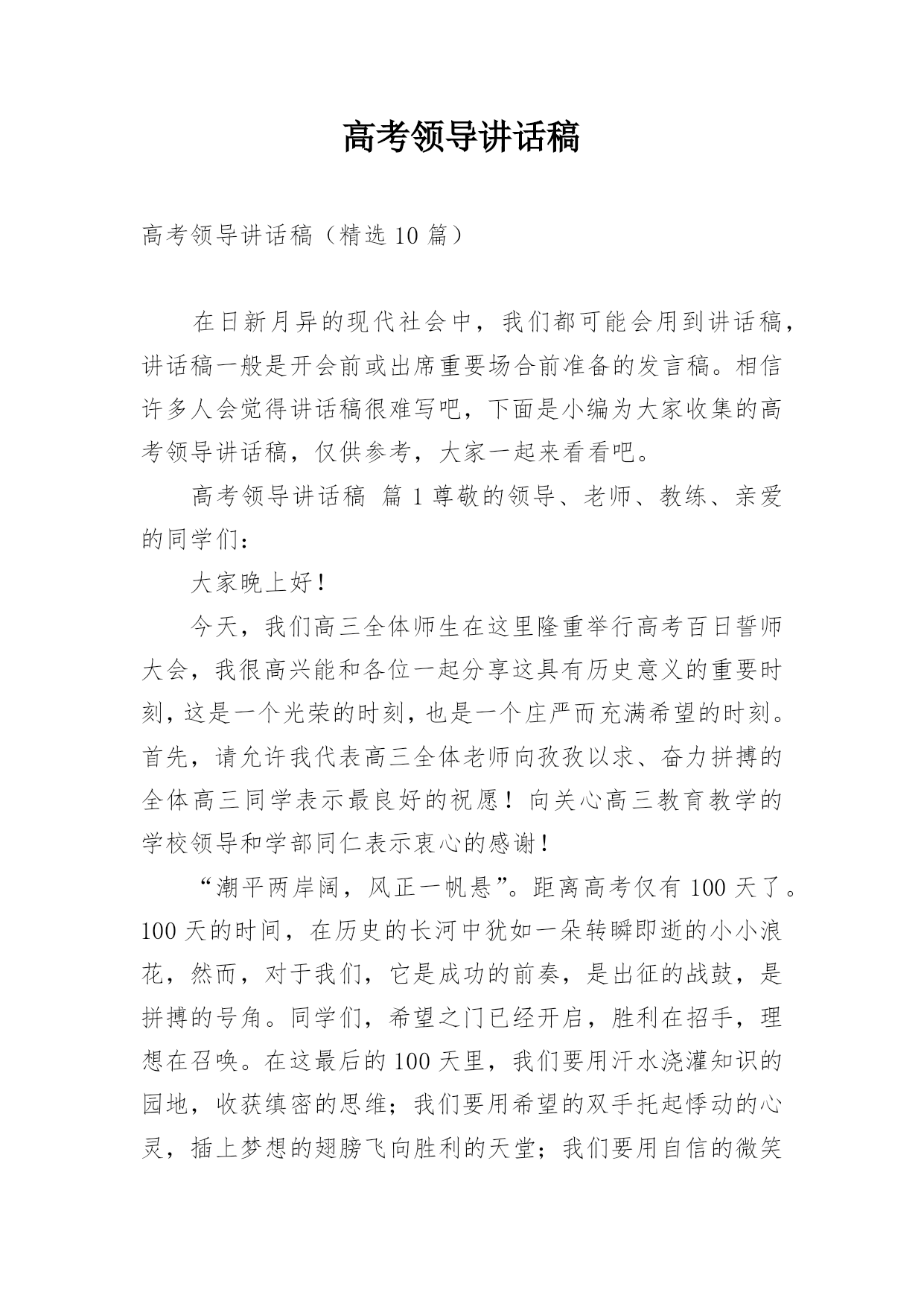 高考领导讲话稿高考领导讲话稿(精选10篇)在日新月异的现代社会中,我们都可能会用到讲话稿,讲话稿一般是开会前或出席重要场合前准备的发言稿。相信许多人会觉得讲话稿很难写吧,下面是小编为大家收集的高考领导讲话稿,仅供参考,大家一起来看看吧。高考领导讲话稿篇1尊敬的领导、老师、教练、亲爱的同学们:大家晚上好!今天,我们高三全体师生在这里隆重举行高考百日誓师大会,我很高兴能和各位一起分享这具有历史意义的重要时刻,这是一个光荣的时刻,也是一个庄严而充满希望的时刻。首先,请允许我代表高三全体老师向孜孜以求、奋力拼搏的