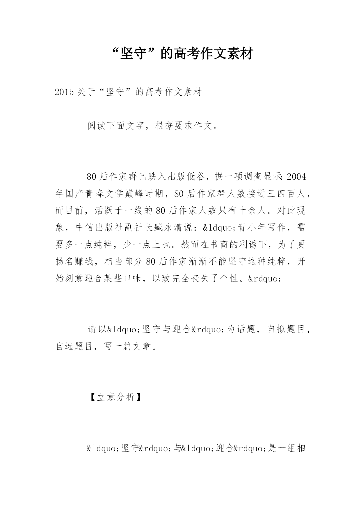 “坚守”的高考作文素材2015关于“坚守”的高考作文素材阅读下面文字,根据要求作文。80后作家群已跌入出版低谷,据一项调查显示:2004年国产青春文学巅峰时期,80后作家群人数接近三四百人,而目前,活跃于一线的80后作家人数只有十余人。对此现象,中信出版社副社长臧永清说:“青小年写作,需要多一点纯粹,少一点上也。然而在书商的利诱下,为了更扬名赚钱,相当部分80后作家渐渐不能坚守这种纯粹,开始刻意迎合某些口味,以致完全丧失了个性。”请以“坚守与迎合”为话题,自