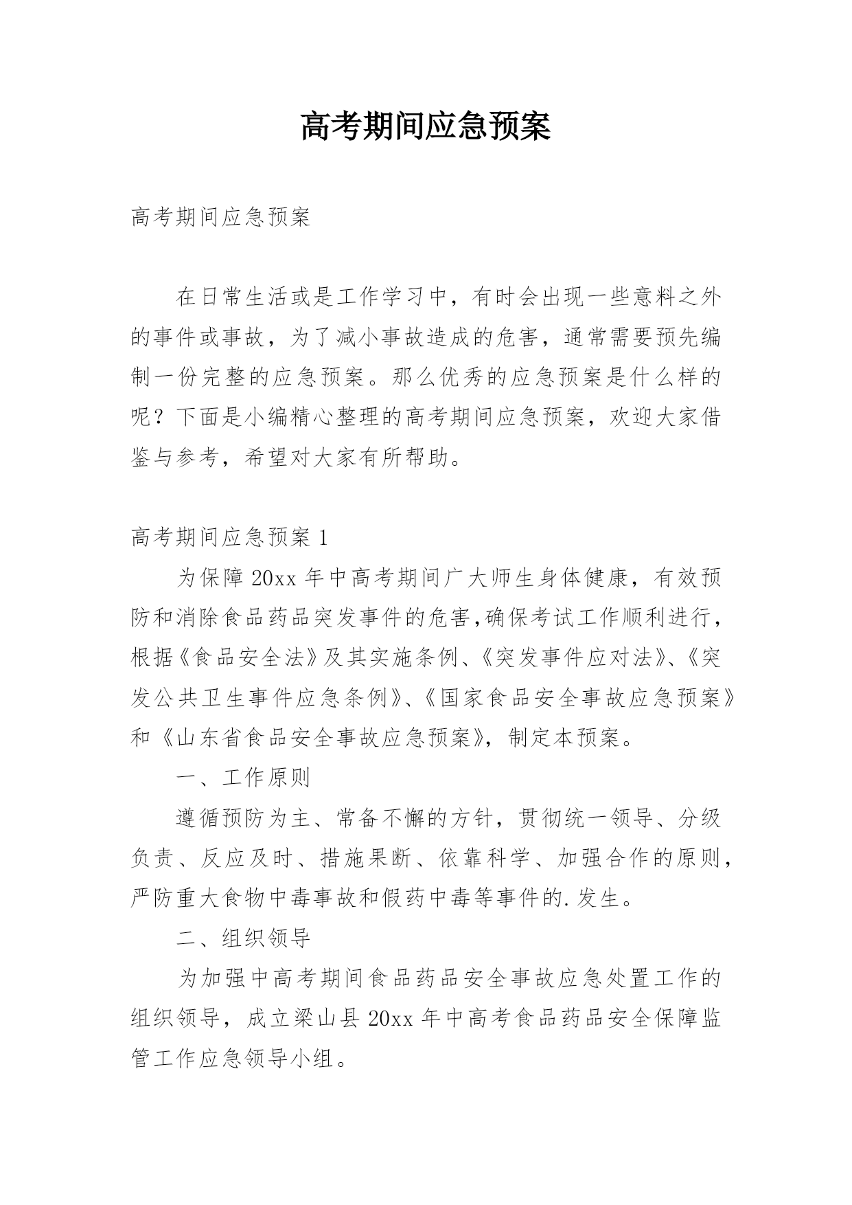 高考期间应急预案高考期间应急预案在日常生活或是工作学习中,有时会出现一些意料之外的事件或事故,为了减小事故造成的危害,通常需要预先编制一份完整的应急预案。那么优秀的应急预案是什么样的呢?下面是小编精心整理的高考期间应急预案,欢迎大家借鉴与参考,希望对大家有所帮助。高考期间应急预案1为保障20xx年中高考期间广大师生身体健康,有效预防和消除食品药品突发事件的危害,确保考试工作顺利进行,根据《食品安全法》及其实施条例、《突发事件应对法》、《突发公共卫生事件应急条例》、《国家食品安全事故应急预案》和《山东省食品