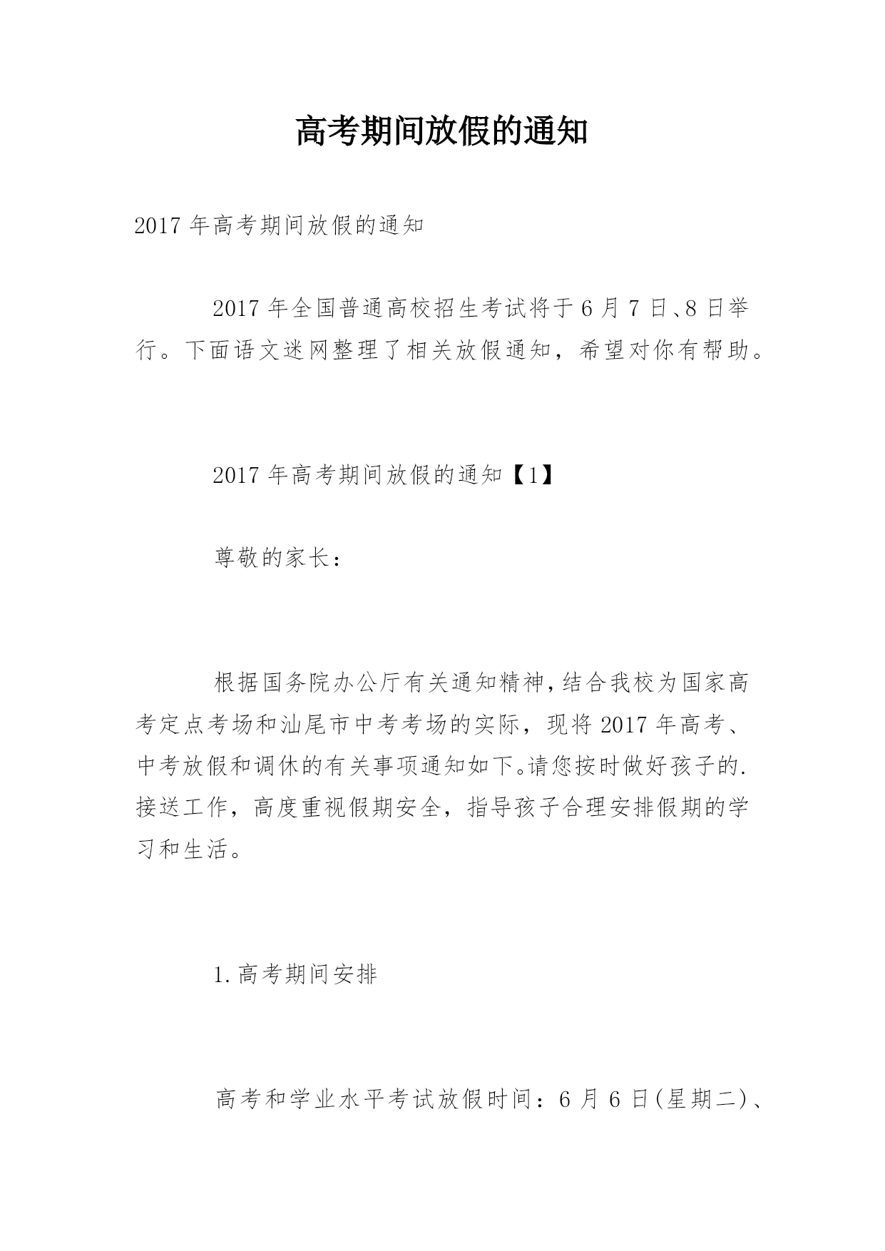 高考期间放假的通知2017年高考期间放假的通知2017年全国普通高校招生考试将于6月7日、8日举行。下面语文迷网整理了相关放假通知,希望对你有帮助。2017年高考期间放假的通知【1】尊敬的家长:根据国务院办公厅有关通知精神,结合我校为国家高考定点考场和汕尾市中考考场的实际,现将2017年高考、中考放假和调休的有关事项通知如下。请您按时做好孩子的.接送工作,高度重视假期安全,指导孩子合理安排假期的学习和生活。1.高考期间安排高考和学业水平考试放假时间:6月6日(星期二)、7日(星期三)、8日(星期四)、9日
