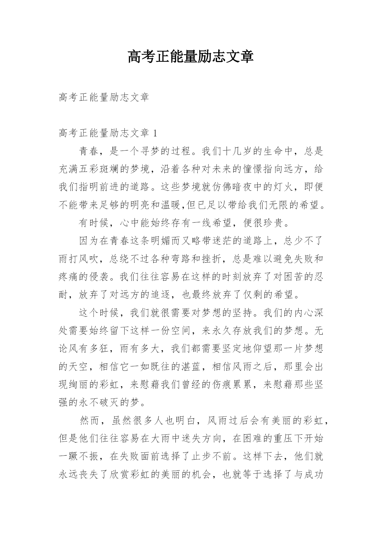 高考正能量励志文章高考正能量励志文章高考正能量励志文章1青春,是一个寻梦的过程。我们十几岁的生命中,总是充满五彩斑斓的梦境,沿着各种对未来的憧憬指向远方,给我们指明前进的道路。这些梦境就仿佛暗夜中的灯火,即便不能带来足够的明亮和温暖,但已足以带给我们无限的希望。有时候,心中能始终存有一线希望,便很珍贵。因为在青春这条明媚而又略带迷茫的道路上,总少不了雨打风吹,总绕不过各种弯路和挫折,总是难以避免失败和疼痛的侵袭。我们往往容易在这样的时刻放弃了对困苦的忍耐,放弃了对远方的追逐,也最终放弃了仅剩的希望。这个时