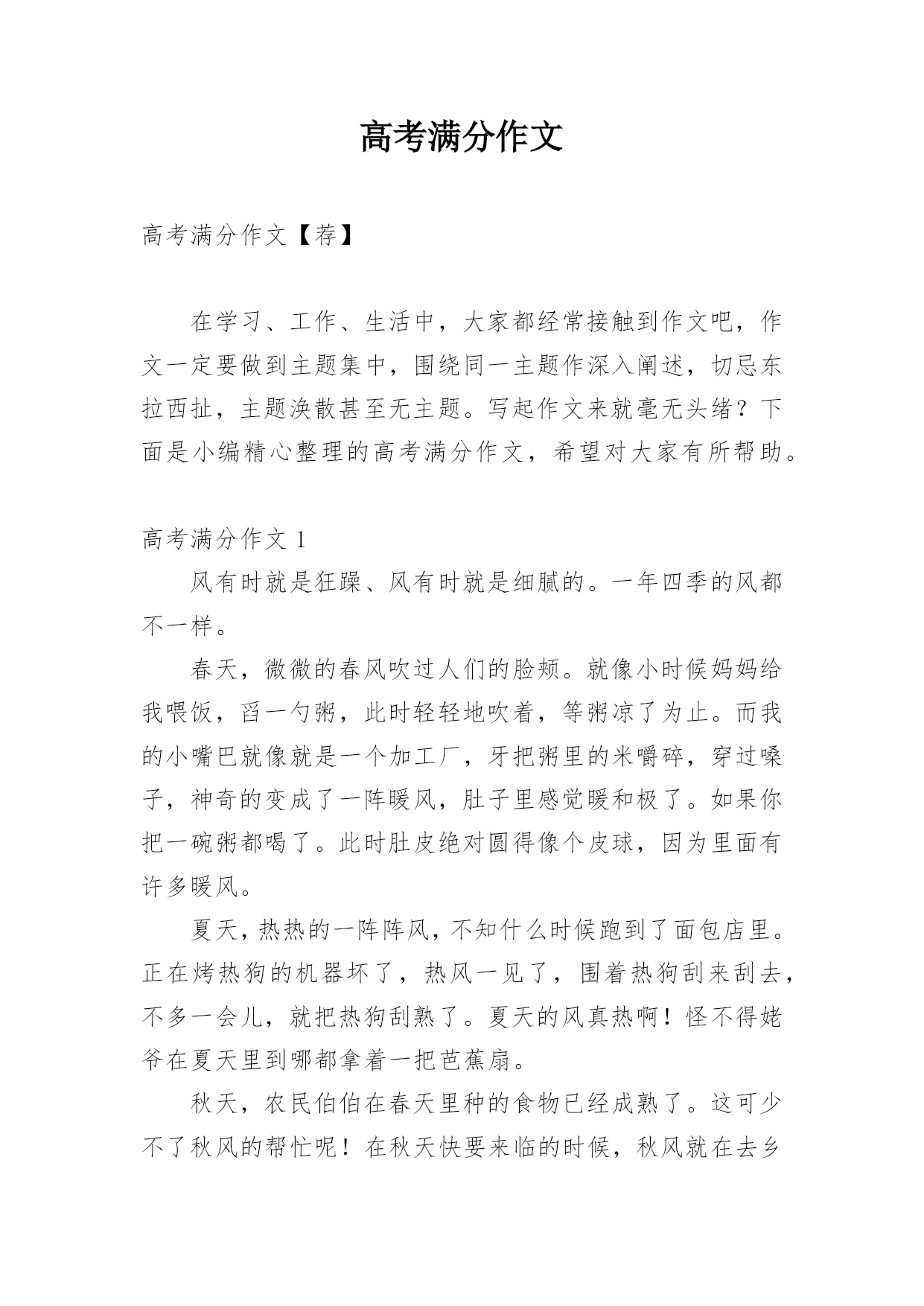 高考满分作文高考满分作文【荐】在学习、工作、生活中,大家都经常接触到作文吧,作文一定要做到主题集中,围绕同一主题作深入阐述,切忌东拉西扯,主题涣散甚至无主题。写起作文来就毫无头绪?下面是小编精心整理的高考满分作文,希望对大家有所帮助。高考满分作文1风有时就是狂躁、风有时就是细腻的。一年四季的风都不一样。春天,微微的春风吹过人们的脸颊。就像小时候妈妈给我喂饭,舀一勺粥,此时轻轻地吹着,等粥凉了为止。而我的小嘴巴就像就是一个加工厂,牙把粥里的米嚼碎,穿过嗓子,神奇的变成了一阵暖风,肚子里感觉暖和极了。如果你把
