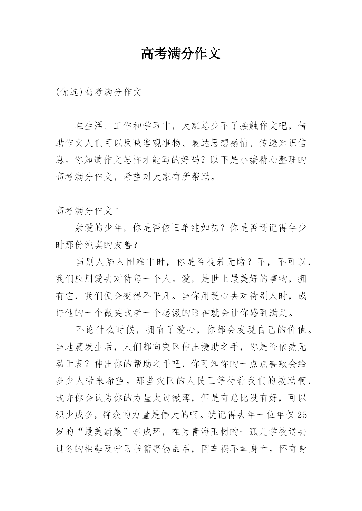 高考满分作文(优选)高考满分作文在生活、工作和学习中,大家总少不了接触作文吧,借助作文人们可以反映客观事物、表达思想感情、传递知识信息。你知道作文怎样才能写的好吗?以下是小编精心整理的高考满分作文,希望对大家有所帮助。高考满分作文1亲爱的少年,你是否依旧单纯如初?你是否还记得年少时那份纯真的友善?当别人陷入困难中时,你是否视若无睹?不,不可以,我们应用爱去对待每一个人。爱,是世上最美好的事物,拥有它,我们便会变得不平凡。当你用爱心去对待别人时,或许他的一个微笑或者一个感激的眼神就会让你感到满足。不论什么时