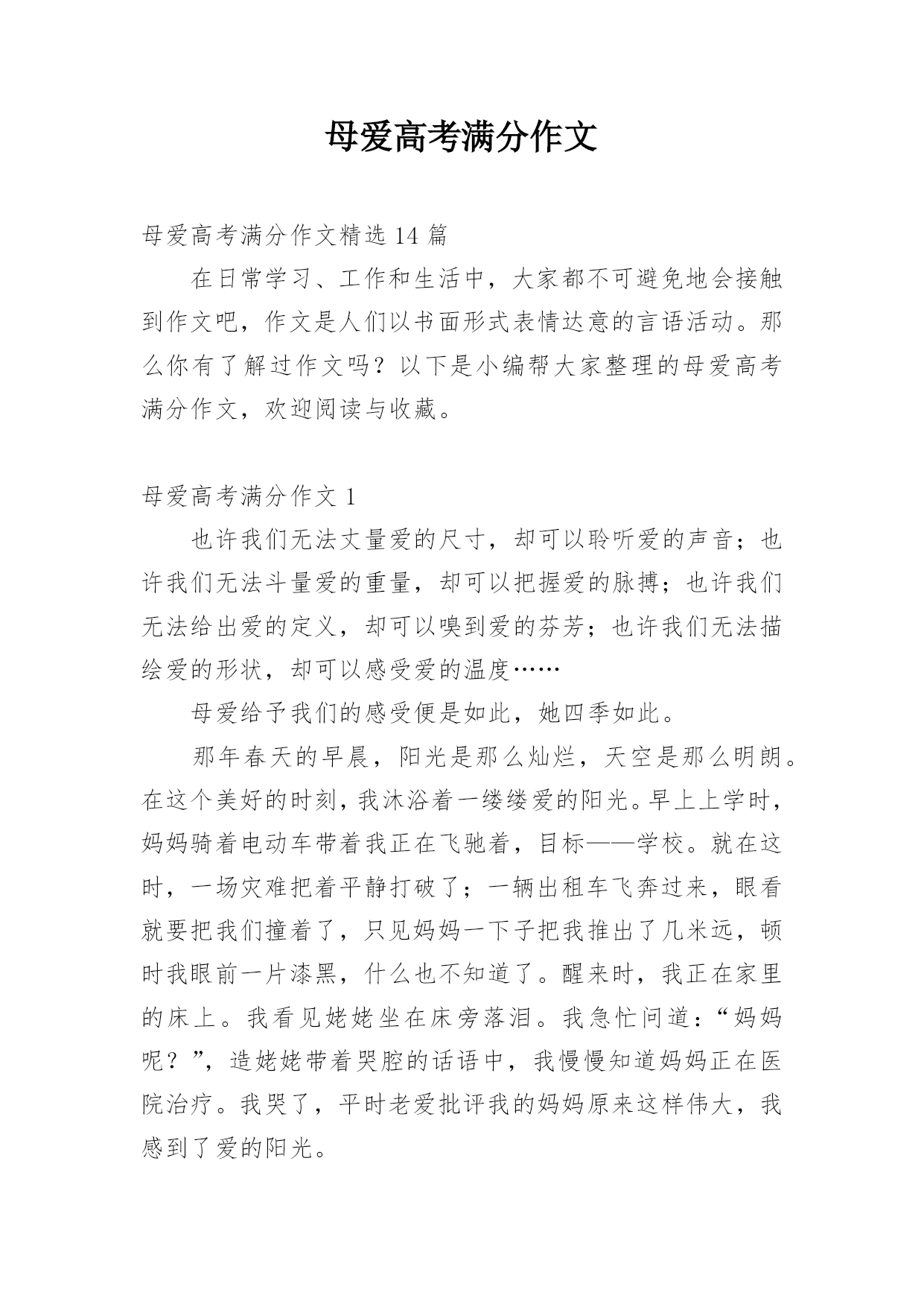 母爱高考满分作文母爱高考满分作文精选14篇在日常学习、工作和生活中,大家都不可避免地会接触到作文吧,作文是人们以书面形式表情达意的言语活动。那么你有了解过作文吗?以下是小编帮大家整理的母爱高考满分作文,欢迎阅读与收藏。母爱高考满分作文1也许我们无法丈量爱的尺寸,却可以聆听爱的声音;也许我们无法斗量爱的重量,却可以把握爱的脉搏;也许我们无法给出爱的定义,却可以嗅到爱的芬芳;也许我们无法描绘爱的形状,却可以感受爱的温度……母爱给予我们的感受便是如此,她四季如此。那年春天的早晨,阳光是那么灿烂,天空是那么明朗。