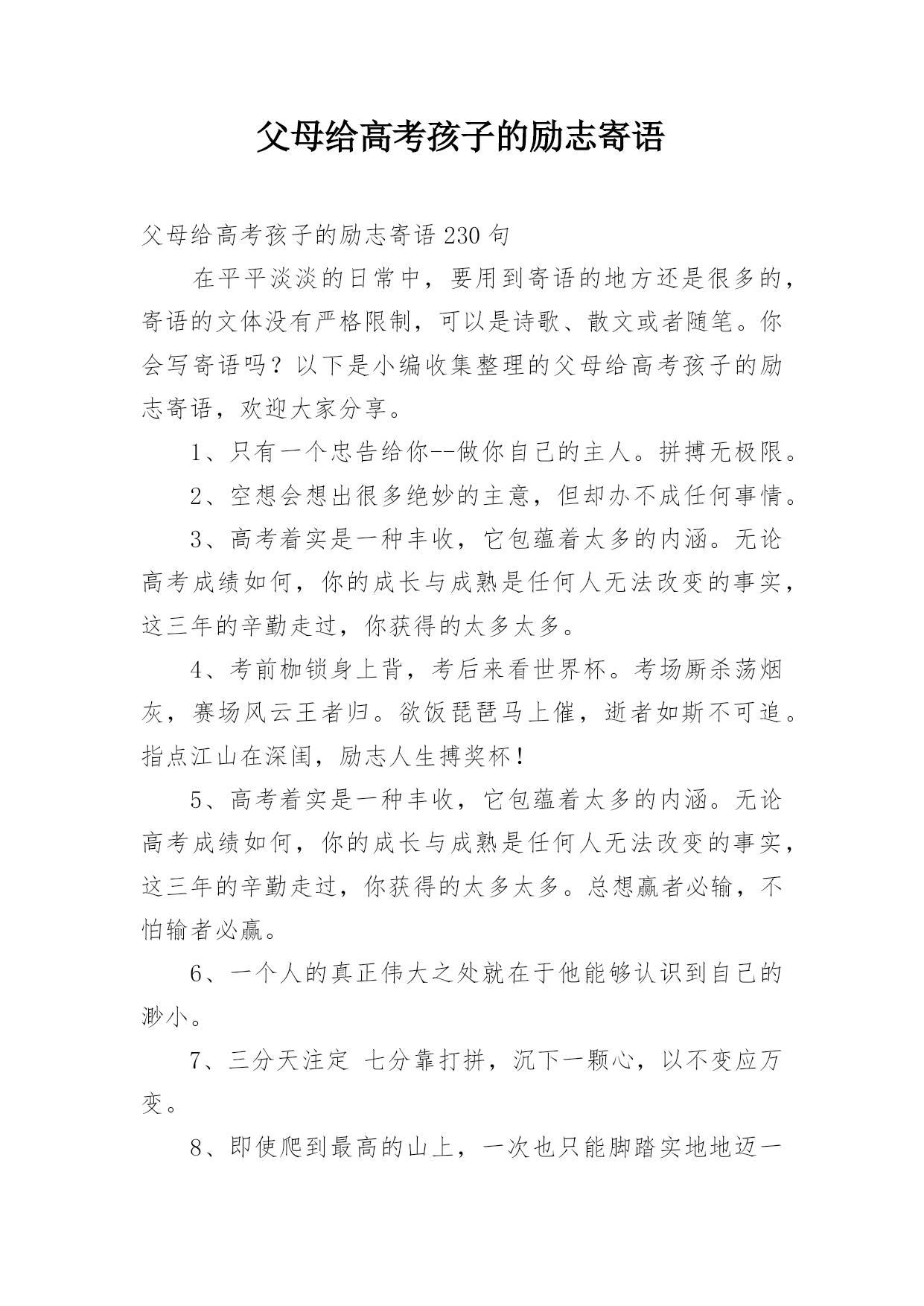 父母给高考孩子的励志寄语父母给高考孩子的励志寄语230句在平平淡淡的日常中,要用到寄语的地方还是很多的,寄语的文体没有严格限制,可以是诗歌、散文或者随笔。你会写寄语吗?以下是小编收集整理的父母给高考孩子的励志寄语,欢迎大家分享。1、只有一个忠告给你--做你自己的主人。拼搏无极限。2、空想会想出很多绝妙的主意,但却办不成任何事情。3、高考着实是一种丰收,它包蕴着太多的内涵。无论高考成绩如何,你的成长与成熟是任何人无法改变的事实,这三年的辛勤走过,你获得的太多太多。4、考前枷锁身上背,考后来看世界杯。考场厮杀