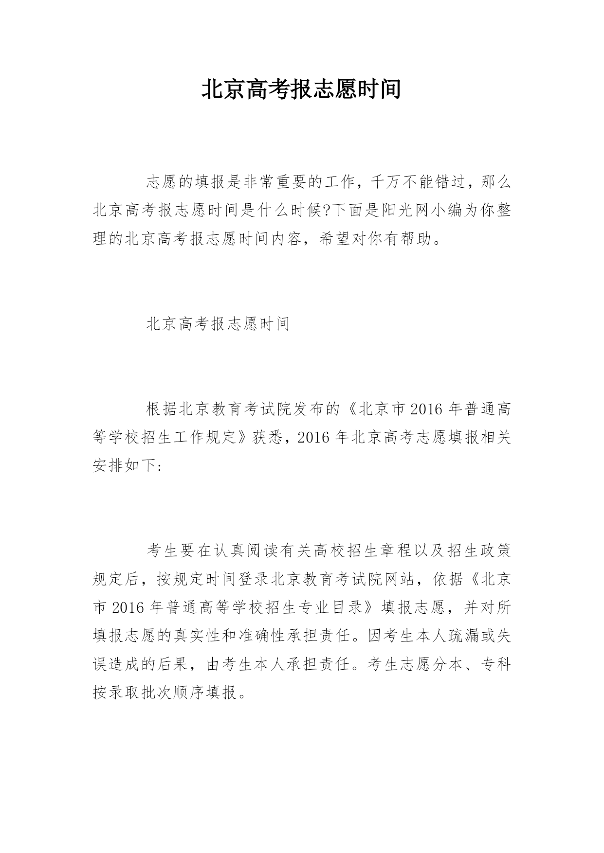 北京高考报志愿时间志愿的填报是非常重要的工作,千万不能错过,那么北京高考报志愿时间是什么时候?下面是阳光网小编为你整理的北京高考报志愿时间内容,希望对你有帮助。北京高考报志愿时间根据北京教育考试院发布的《北京市2016年普通高等学校招生工作规定》获悉,2016年北京高考志愿填报相关安排如下:考生要在认真阅读有关高校招生章程以及招生政策规定后,按规定时间登录北京教育考试院网站,依据《北京市2016年普通高等学校招生专业目录》填报志愿,并对所填报志愿的真实性和准确性承担责任。因考生本人疏漏或失误造成的后果,由
