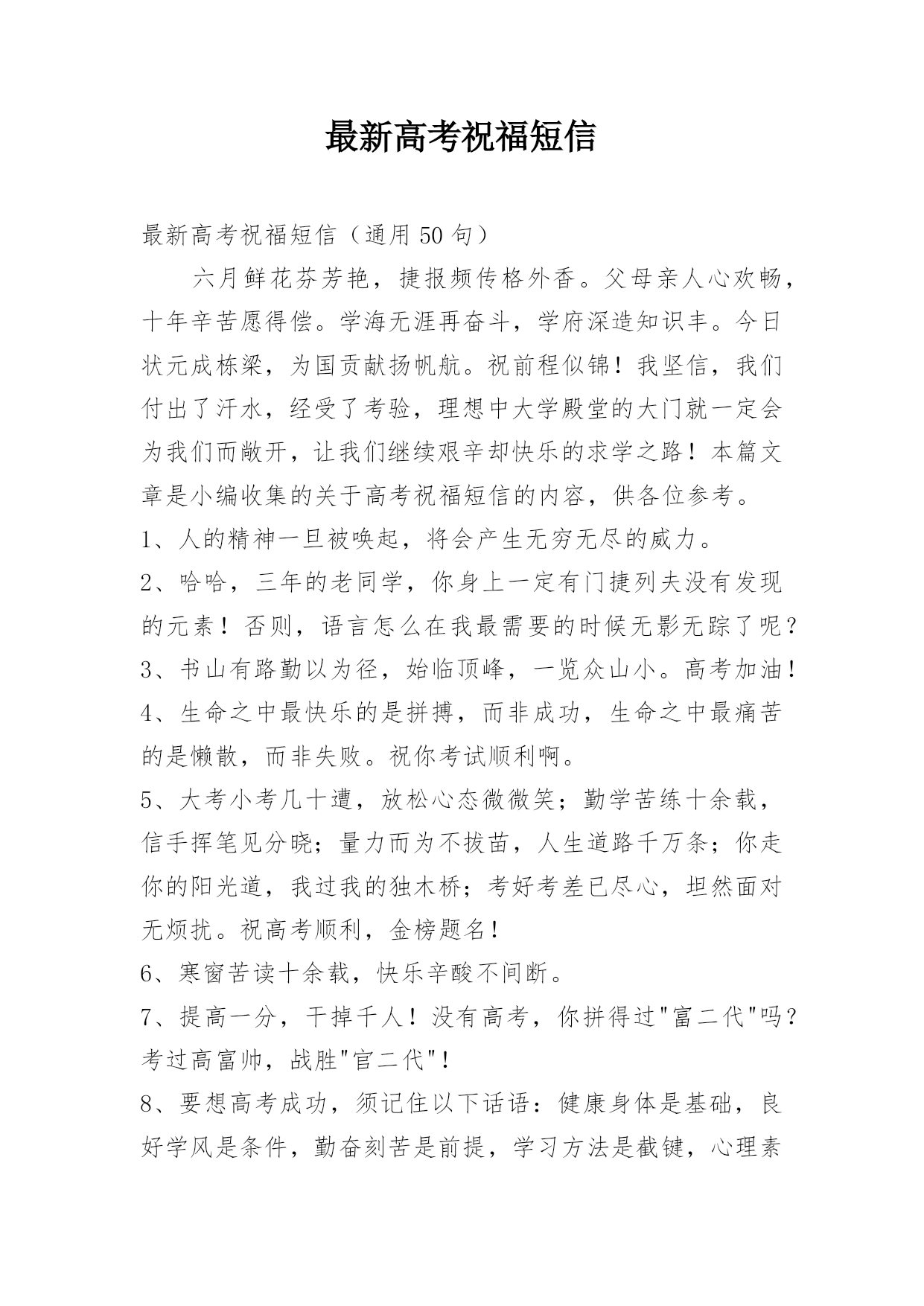 最新高考祝福短信最新高考祝福短信(通用50句)六月鲜花芬芳艳,捷报频传格外香。父母亲人心欢畅,十年辛苦愿得偿。学海无涯再奋斗,学府深造知识丰。今日状元成栋梁,为国贡献扬帆航。祝前程似锦!我坚信,我们付出了汗水,经受了考验,理想中大学殿堂的大门就一定会为我们而敞开,让我们继续艰辛却快乐的求学之路!本篇文章是小编收集的关于高考祝福短信的内容,供各位参考。1、人的精神一旦被唤起,将会产生无穷无尽的威力。2、哈哈,三年的老同学,你身上一定有门捷列夫没有发现的元素!否则,语言怎么在我最需要的时候无影无踪了呢?3、书
