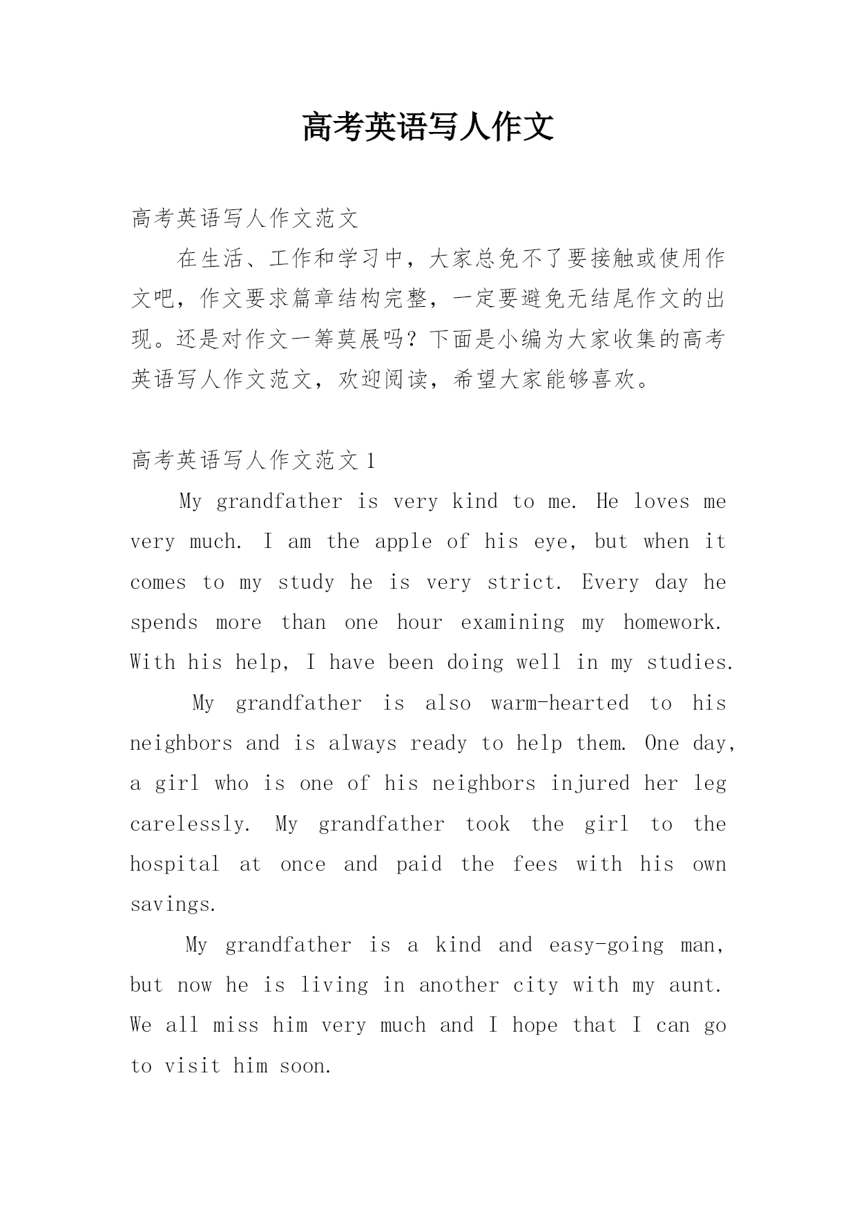 高考英语写人作文高考英语写人作文范文在生活、工作和学习中,大家总免不了要接触或使用作文吧,作文要求篇章结构完整,一定要避免无结尾作文的出现。还是对作文一筹莫展吗?下面是小编为大家收集的高考英语写人作文范文,欢迎阅读,希望大家能够喜欢。高考英语写人作文范文1Mygrandfatherisverykindtome.Helovesmeverymuch.Iamtheappleofhiseye,butwhenitcomestomystudyheisverystrict.Everydayhespendsmoretha
