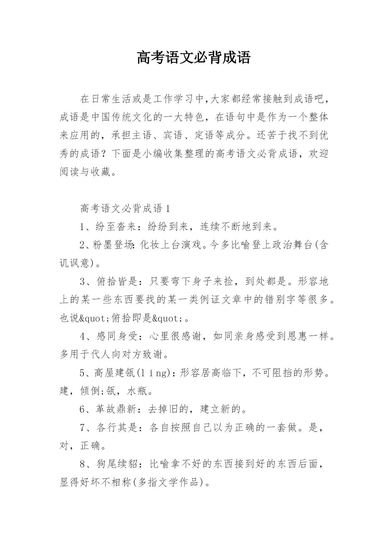 高考语文必背成语在日常生活或是工作学习中,大家都经常接触到成语吧,成语是中国传统文化的一大特色,在语句中是作为一个整体来应用的,承担主语、宾语、定语等成分。还苦于找不到优秀的成语?下面是小编收集整理的高考语文必背成语,欢迎阅读与收藏。高考语文必背成语11、纷至沓来:纷纷到来,连续不断地到来。2、粉墨登场:化妆上台演戏。今多比喻登上政治舞台(含讥讽意)。3、俯拾皆是:只要弯下身子来捡,到处都是。形容地上的某一些东西要找的某一类例证文章中的错别字等很多。也说"俯拾即是"。4、感同身受:心里