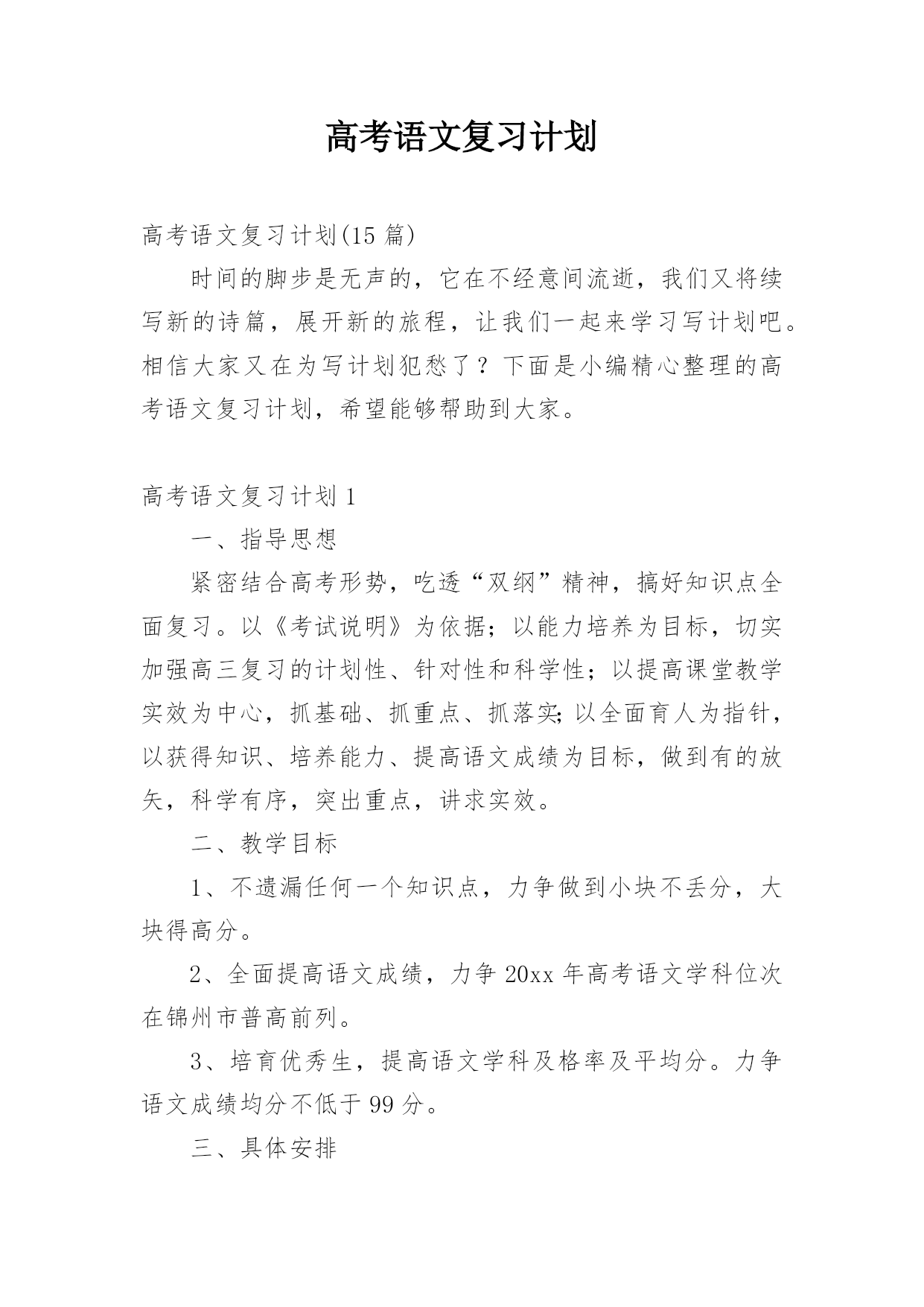 高考语文复习计划高考语文复习计划(15篇)时间的脚步是无声的,它在不经意间流逝,我们又将续写新的诗篇,展开新的旅程,让我们一起来学习写计划吧。相信大家又在为写计划犯愁了?下面是小编精心整理的高考语文复习计划,希望能够帮助到大家。高考语文复习计划1一、指导思想紧密结合高考形势,吃透“双纲”精神,搞好知识点全面复习。以《考试说明》为依据;以能力培养为目标,切实加强高三复习的计划性、针对性和科学性;以提高课堂教学实效为中心,抓基础、抓重点、抓落实;以全面育人为指针,以获得知识、培养能力、提高语文成绩为目标,做到