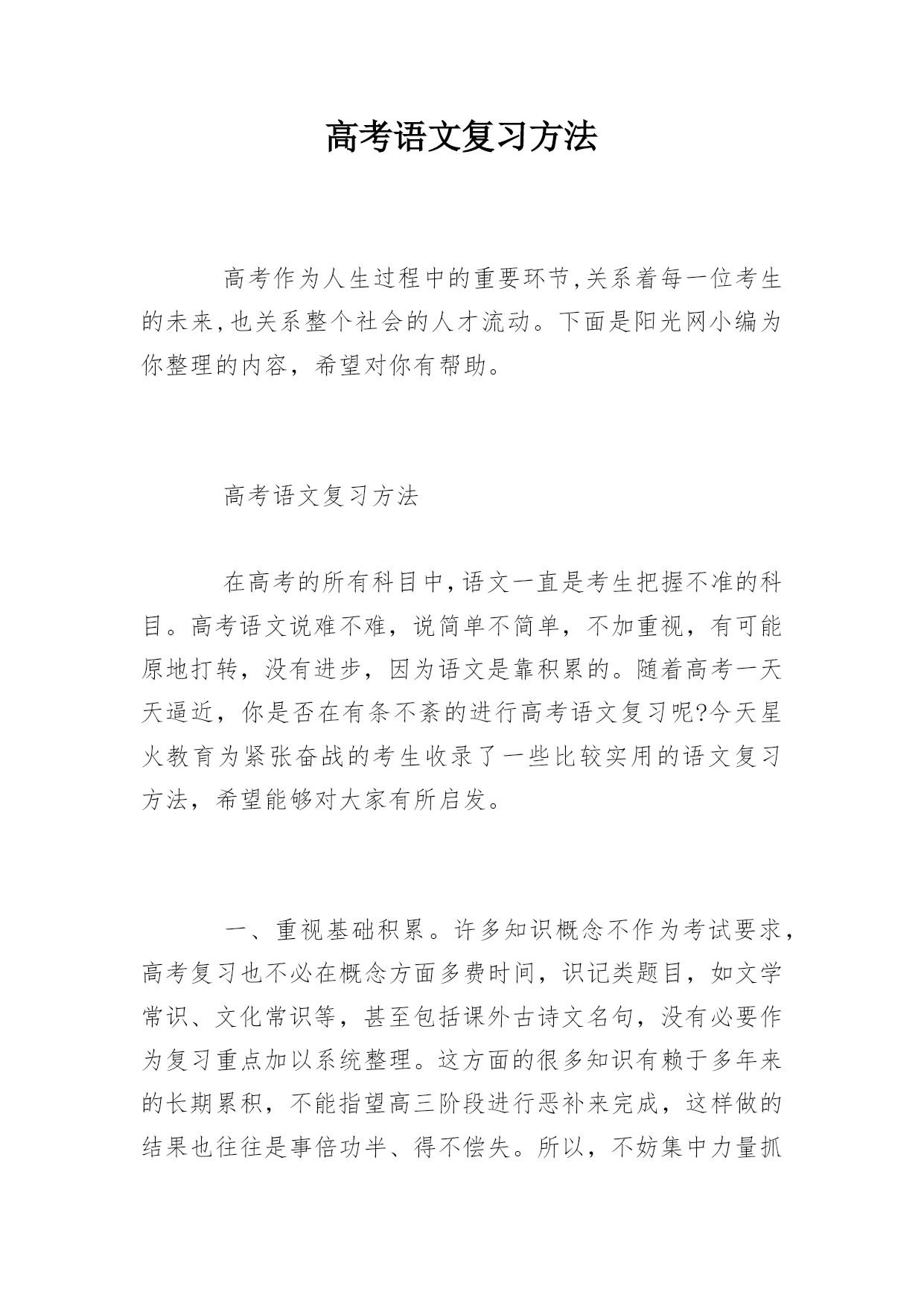 高考语文复习方法高考作为人生过程中的重要环节,关系着每一位考生的未来,也关系整个社会的人才流动。下面是阳光网小编为你整理的内容,希望对你有帮助。高考语文复习方法在高考的所有科目中,语文一直是考生把握不准的科目。高考语文说难不难,说简单不简单,不加重视,有可能原地打转,没有进步,因为语文是靠积累的。随着高考一天天逼近,你是否在有条不紊的进行高考语文复习呢?今天星火教育为紧张奋战的考生收录了一些比较实用的语文复习方法,希望能够对大家有所启发。一、重视基础积累。许多知识概念不作为考试要求,高考复习也不必在概念方