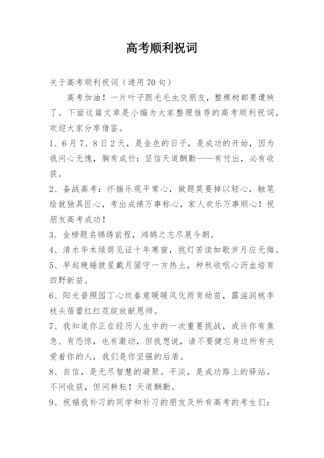 高考顺利祝词关于高考顺利祝词(通用70句)高考加油!一片叶子跟毛毛虫交朋友,整棵树都要遭殃了。下面这篇文章是小编为大家整理推荐的高考顺利祝词,欢迎大家分享借鉴。1、6月7、8日2天,是金色的日子,是成功的开始,因为我问心无愧,胸有成竹;坚信天道酬勤——有付出,必有收获。2、备战高考:怀揣乐观平常心,做题莫要掉以轻心,触笔绘就独具匠心,考出成绩万事称心,家人欢乐万事顺心!祝朋友高考成功!3、金榜题名锦绣前程,鸿鹄之志尽展今朝。4、清水华木绿荫见证十年寒窗,挑灯苦读如歌岁月应无悔。5、早起晚睡披星戴月固守一方