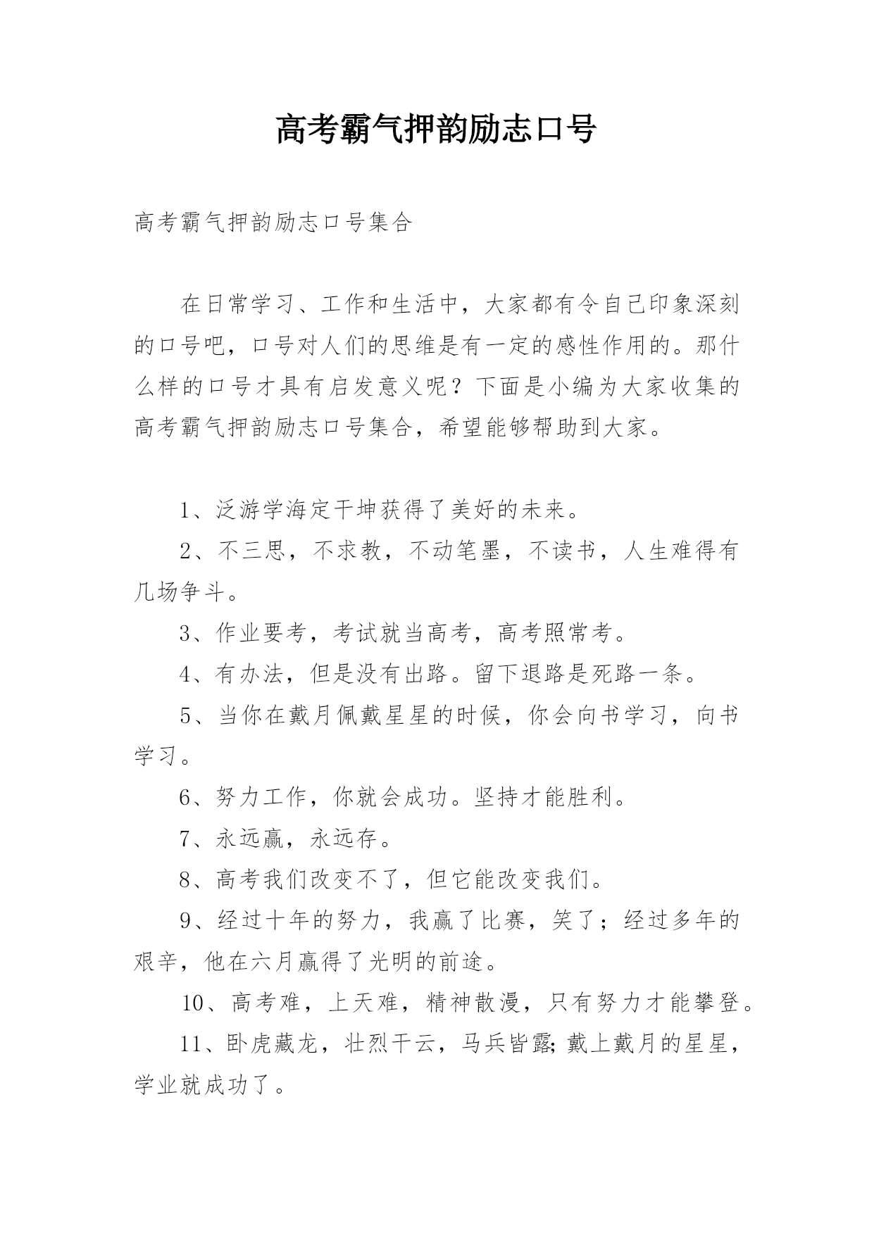 高考霸气押韵励志口号高考霸气押韵励志口号集合在日常学习、工作和生活中,大家都有令自己印象深刻的口号吧,口号对人们的思维是有一定的感性作用的。那什么样的口号才具有启发意义呢?下面是小编为大家收集的高考霸气押韵励志口号集合,希望能够帮助到大家。1、泛游学海定干坤获得了美好的未来。2、不三思,不求教,不动笔墨,不读书,人生难得有几场争斗。3、作业要考,考试就当高考,高考照常考。4、有办法,但是没有出路。留下退路是死路一条。5、当你在戴月佩戴星星的时候,你会向书学习,向书学习。6、努力工作,你就会成功。坚持才能胜