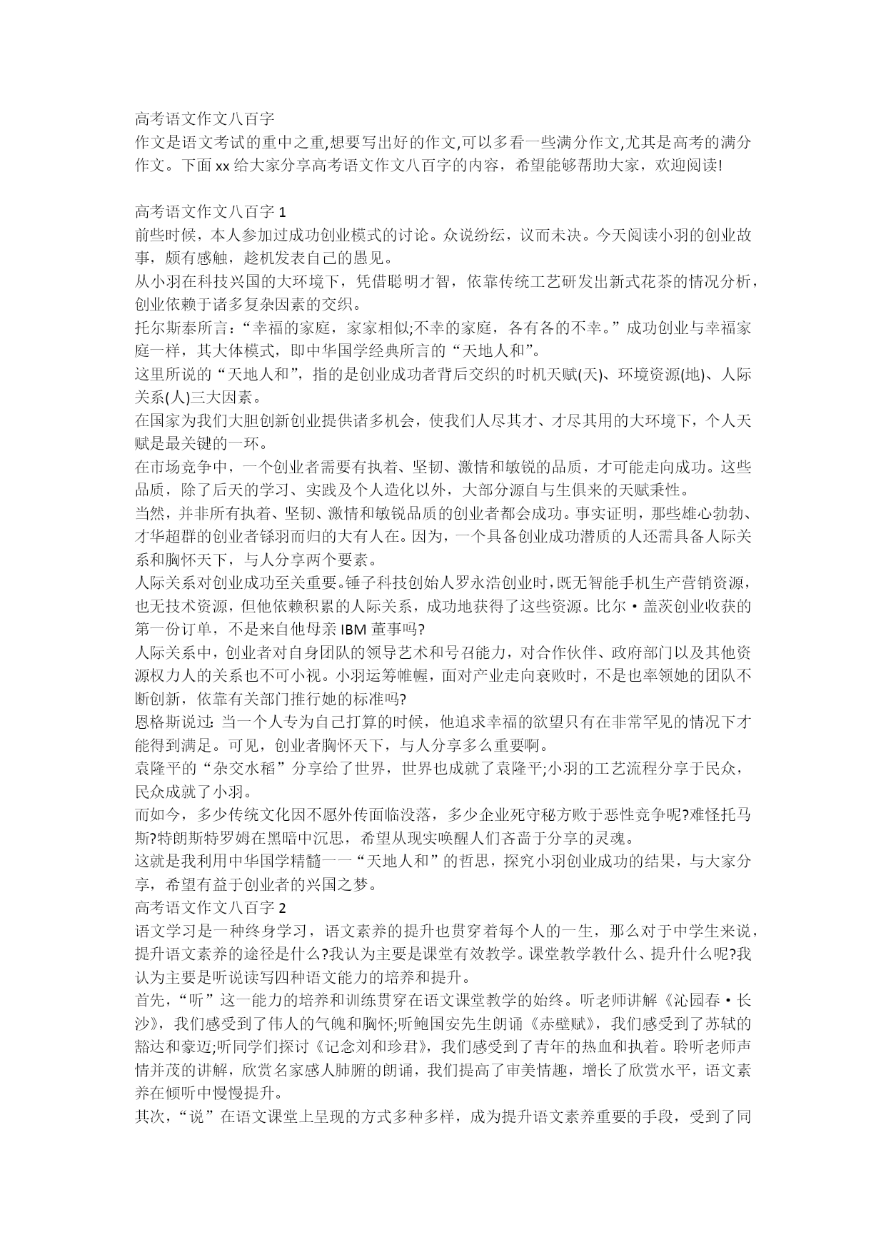 高考语文作文八百字作文是语文考试的重中之重,想要写出好的作文,可以多看一些满分作文,尤其是高考的满分作文。下面xx给大家分享高考语文作文八百字的内容,希望能够帮助大家,欢迎阅读!高考语文作文八百字1前些时候,本人参加过成功创业模式的讨论。众说纷纭,议而未决。今天阅读小羽的创业故事,颇有感触,趁机发表自己的愚见。从小羽在科技兴国的大环境下,凭借聪明才智,依靠传统工艺研发出新式花茶的情况分析,创业依赖于诸多复杂因素的交织。托尔斯泰所言:“幸福的家庭,家家相似;不幸的家庭,各有各的不幸。”成功创业与幸福家庭一样