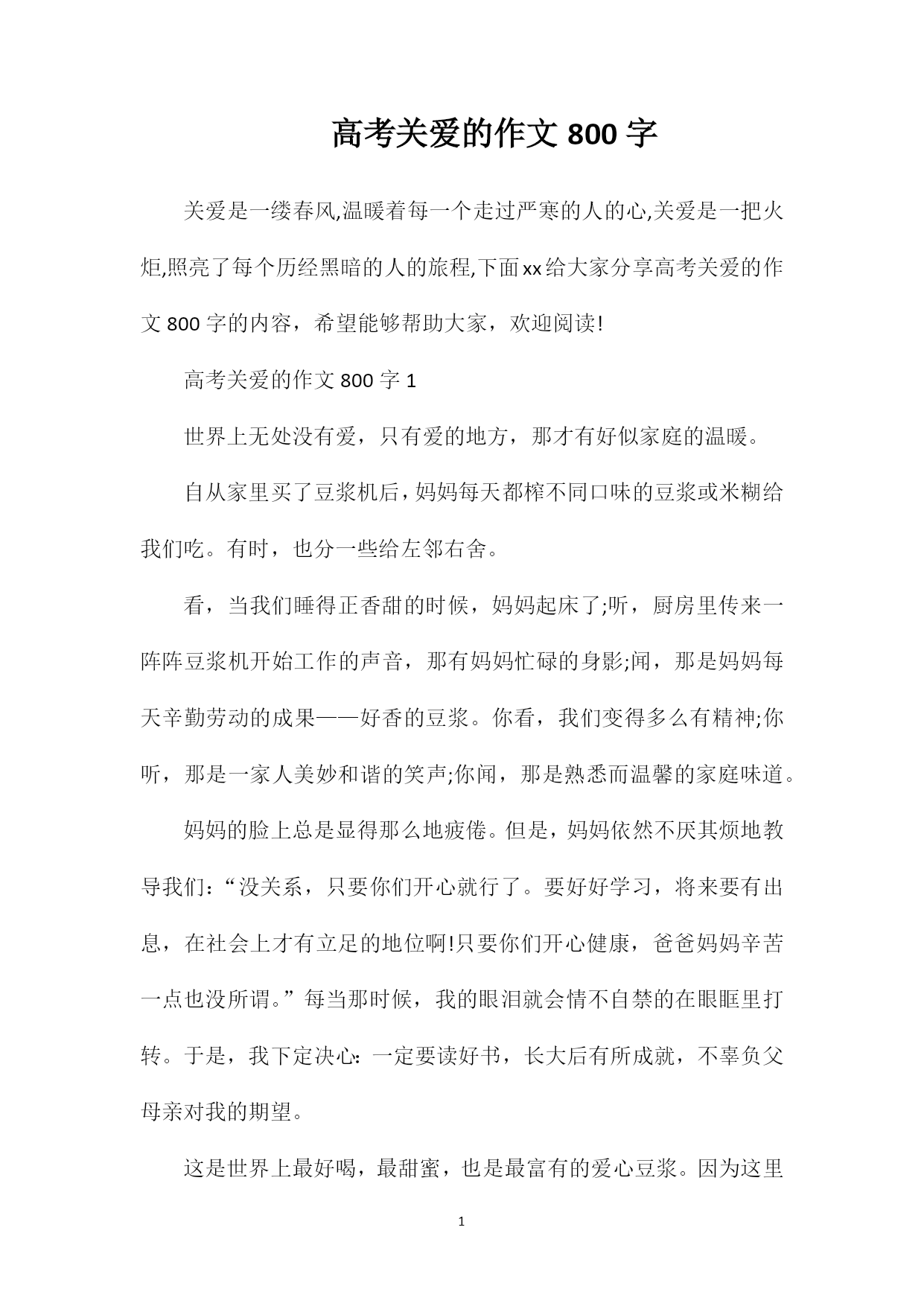 PAGEPAGE14高考关爱的作文800字关爱是一缕春风,温暖着每一个走过严寒的人的心,关爱是一把火炬,照亮了每个历经黑暗的人的旅程,下面xx给大家分享高考关爱的作文800字的内容,希望能够帮助大家,欢迎阅读!高考关爱的作文800字1世界上无处没有爱,只有爱的地方,那才有好似家庭的温暖。自从家里买了豆浆机后,妈妈每天都榨不同口味的豆浆或米糊给我们吃。有时,也分一些给左邻右舍。看,当我们睡得正香甜的时候,妈妈起床了;听,厨房里传来一阵阵豆浆机开始工作的声音,那有妈妈忙碌的身影;闻,那是妈妈每天辛