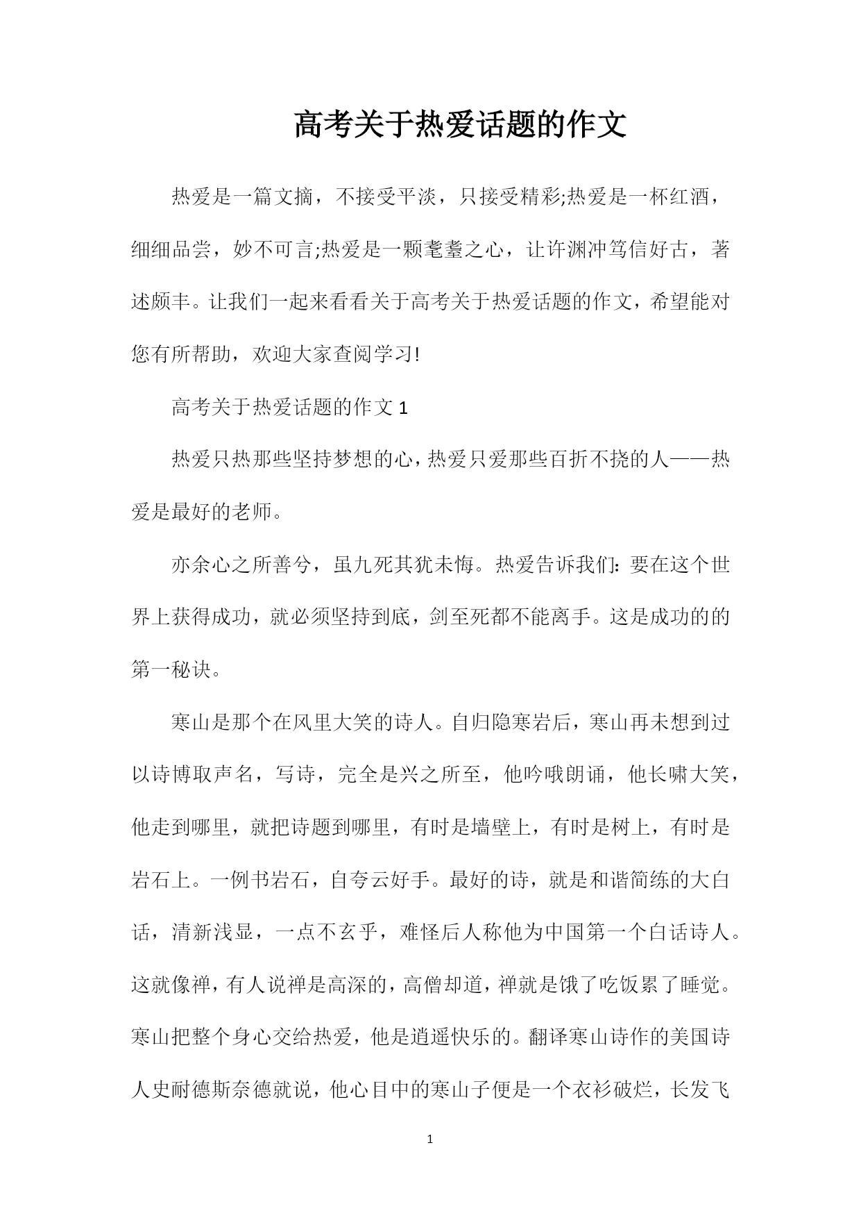 PAGEPAGE10高考关于热爱话题的作文热爱是一篇文摘,不接受平淡,只接受精彩;热爱是一杯红酒,细细品尝,妙不可言;热爱是一颗耄耋之心,让许渊冲笃信好古,著述颇丰。让我们一起来看看关于高考关于热爱话题的作文,希望能对您有所帮助,欢迎大家查阅学习!高考关于热爱话题的作文1热爱只热那些坚持梦想的心,热爱只爱那些百折不挠的人——热爱是最好的老师。亦余心之所善兮,虽九死其犹未悔。热爱告诉我们:要在这个世界上获得成功,就必须坚持到底,剑至死都不能离手。这是成功的的第一秘诀。寒山是那个在风里大笑的诗人。