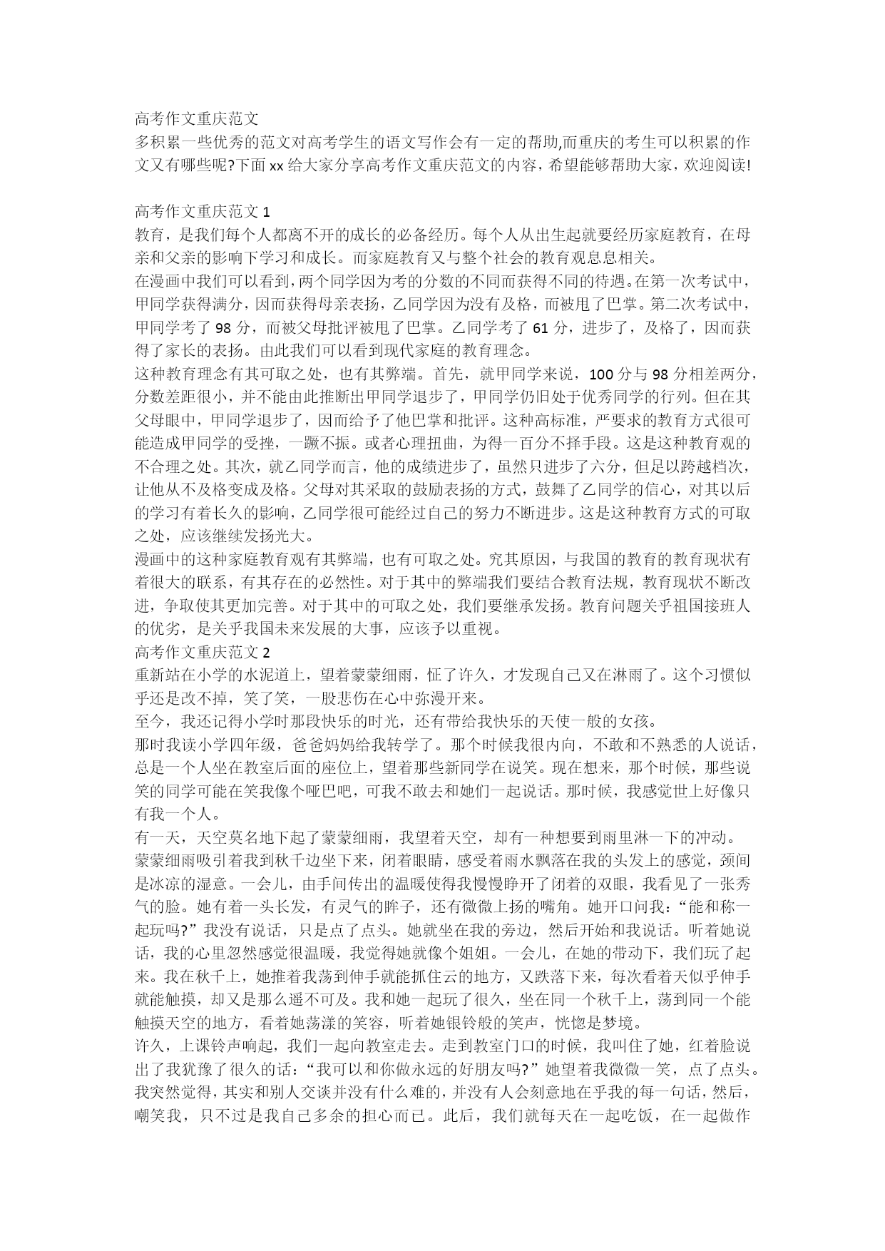 高考作文重庆范文多积累一些优秀的范文对高考学生的语文写作会有一定的帮助,而重庆的考生可以积累的作文又有哪些呢?下面xx给大家分享高考作文重庆范文的内容,希望能够帮助大家,欢迎阅读!高考作文重庆范文1教育,是我们每个人都离不开的成长的必备经历。每个人从出生起就要经历家庭教育,在母亲和父亲的影响下学习和成长。而家庭教育又与整个社会的教育观息息相关。在漫画中我们可以看到,两个同学因为考的分数的不同而获得不同的待遇。在第一次考试中,甲同学获得满分,因而获得母亲表扬,乙同学因为没有及格,而被甩了巴掌。第二次考试中,