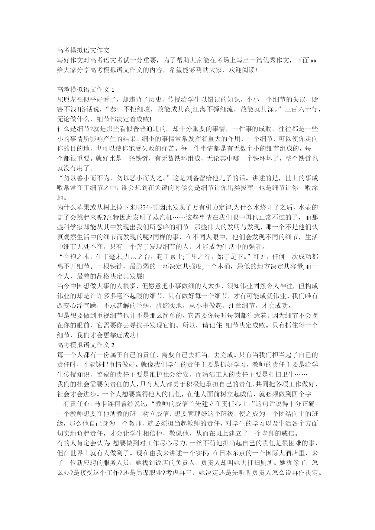 高考模拟语文作文写好作文对高考语文考试十分重要,为了帮助大家能在考场上写出一篇优秀作文,下面xx给大家分享高考模拟语文作文的内容,希望能够帮助大家,欢迎阅读!高考模拟语文作文1屈原左衽似乎好看了,却违背了历史,传授给学生以错误的知识,小小一个细节的失误,贻害不浅!俗话说,“泰山不拒细壤,故能成其高;江海不择细流,故能就其深。”三百六十行,无论做什么,细节都决定着成败!什么是细节?就是那些看似普普通通的,却十分重要的事情,一件事的成败,往往都是一些小的事情所影响产生的结果。细小的事情常常发挥着重大的作用,一