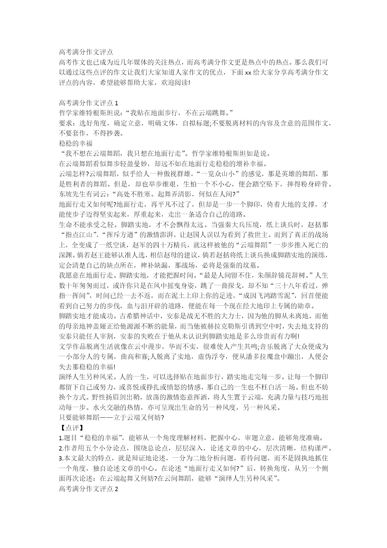 高考满分作文评点高考作文也已成为近几年媒体的关注热点,而高考满分作文更是热点中的热点。那么我们可以通过这些点评的作文让我们大家知道人家作文的优点,下面xx给大家分享高考满分作文评点的内容,希望能够帮助大家,欢迎阅读!高考满分作文评点1哲学家维特根斯坦说:“我贴在地面步行,不在云端跳舞。”要求:选好角度,确定立意,明确文体,自拟标题;不要脱离材料的内容及含意的范围作文,不要套作,不得抄袭。稳稳的幸福“我不想在云端舞蹈,我只想在地面行走”。哲学家维特根斯坦如是说。在云端舞蹈看似舞步轻盈曼妙,却远不如在地面行走