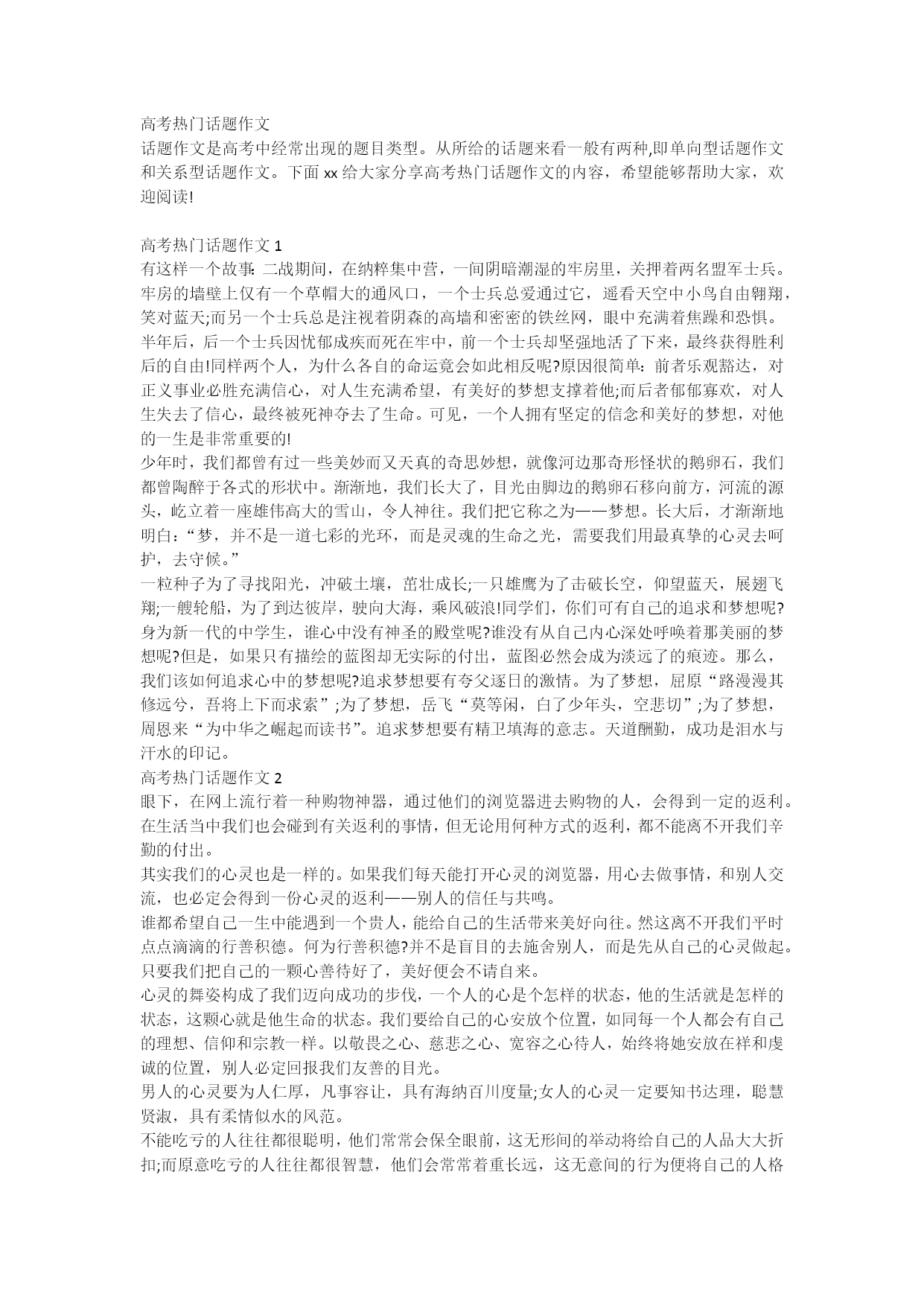 高考热门话题作文话题作文是高考中经常出现的题目类型。从所给的话题来看一般有两种,即单向型话题作文和关系型话题作文。下面xx给大家分享高考热门话题作文的内容,希望能够帮助大家,欢迎阅读!高考热门话题作文1有这样一个故事:二战期间,在纳粹集中营,一间阴暗潮湿的牢房里,关押着两名盟军士兵。牢房的墙壁上仅有一个草帽大的通风口,一个士兵总爱通过它,遥看天空中小鸟自由翱翔,笑对蓝天;而另一个士兵总是注视着阴森的高墙和密密的铁丝网,眼中充满着焦躁和恐惧。半年后,后一个士兵因忧郁成疾而死在牢中,前一个士兵却坚强地活了下来