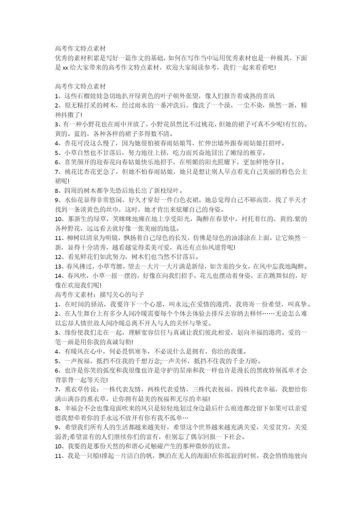 高考作文特点素材优秀的素材积累是写好一篇作文的基础,如何在写作当中运用优秀素材也是一种极其,下面是xx给大家带来的高考作文特点素材,欢迎大家阅读参考,我们一起来看看吧!高考作文特点素材1、这些石榴娃娃急切地扒开绿黄色的叶子朝外张望,像人们报告着成熟的喜讯2、原无精打采的树木,经过雨水的一番冲洗后,像洗了一个澡,一尘不染,焕然一新,精神抖擞了!3、有一种小野花也在雨中开放了,小野花虽然比不过桃花,但她的裙子可真不少呢!有红的。黄的。蓝的,各种各样的裙子多得数不清。4、杏花可没这么慢了,因为她很怕被春雨姑娘骂