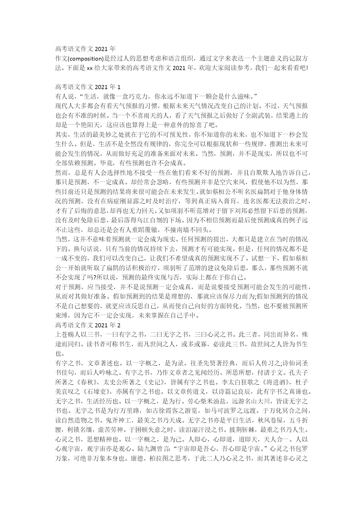 高考语文作文2021年作文(composition)是经过人的思想考虑和语言组织,通过文字来表达一个主题意义的记叙方法。下面是xx给大家带来的高考语文作文2021年,欢迎大家阅读参考,我们一起来看看吧!高考语文作文2021年1有人说,“生活,就像一盒巧克力,你永远不知道下一颗会是什么滋味。”现代人大多都会有看天气预报的习惯,根据未来天气情况改变自己的计划。不过,天气预报也会有不准的时候。当一个不喜雨天的人,看了天气预报之后做好了全副武装,结果遇上的却是一个艳阳天,这应该也算得上是一种意外的惊喜了吧。其实,