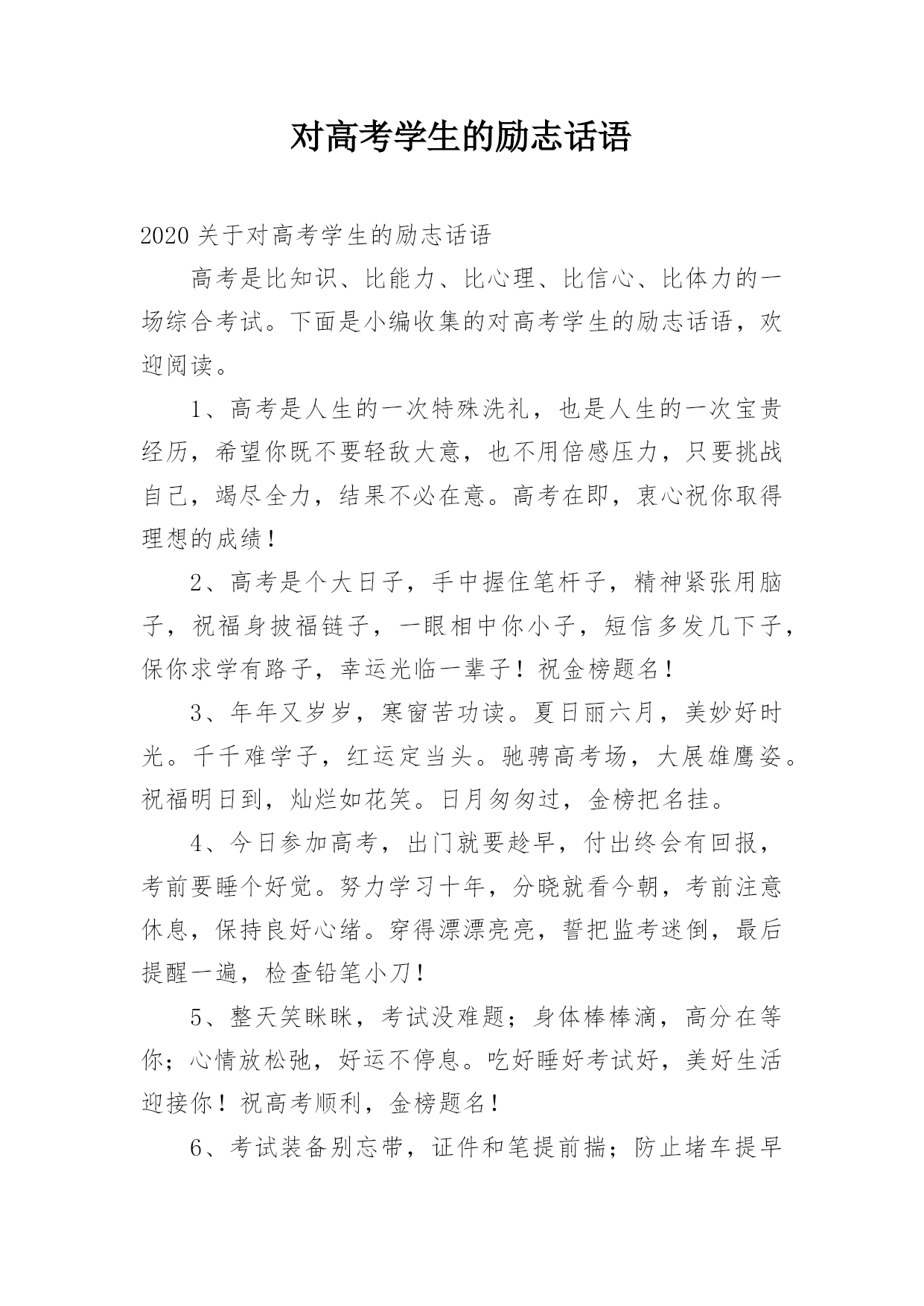 对高考学生的励志话语2020关于对高考学生的励志话语高考是比知识、比能力、比心理、比信心、比体力的一场综合考试。下面是小编收集的对高考学生的励志话语,欢迎阅读。1、高考是人生的一次特殊洗礼,也是人生的一次宝贵经历,希望你既不要轻敌大意,也不用倍感压力,只要挑战自己,竭尽全力,结果不必在意。高考在即,衷心祝你取得理想的成绩!2、高考是个大日子,手中握住笔杆子,精神紧张用脑子,祝福身披福链子,一眼相中你小子,短信多发几下子,保你求学有路子,幸运光临一辈子!祝金榜题名!3、年年又岁岁,寒窗苦功读。夏日丽六月,美