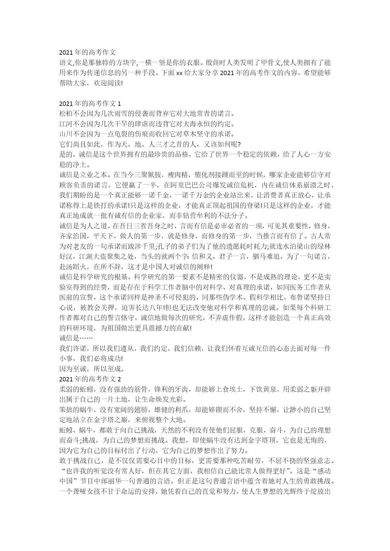 2021年的高考作文语文,你是那独特的方块字,一横一竖是你的衣服。殷商时人类发明了甲骨文,使人类拥有了能用来作为传递信息的另一种手段。下面xx给大家分享2021年的高考作文的内容,希望能够帮助大家,欢迎阅读!2021年的高考作文1松柏不会因为几次雨雪的侵袭而背弃它对大地常青的诺言。江河不会因为几次干旱的肆虐而违背它对大海永恒的约定。山川不会因为一点龟裂的伤痕而收回它对草木坚守的承诺。它们尚且如此,作为天、地、人三才之首的人,又该如何呢?是的,诚信是这个世界拥有的最珍贵的品格,它给了世界一个稳定的依赖,给了