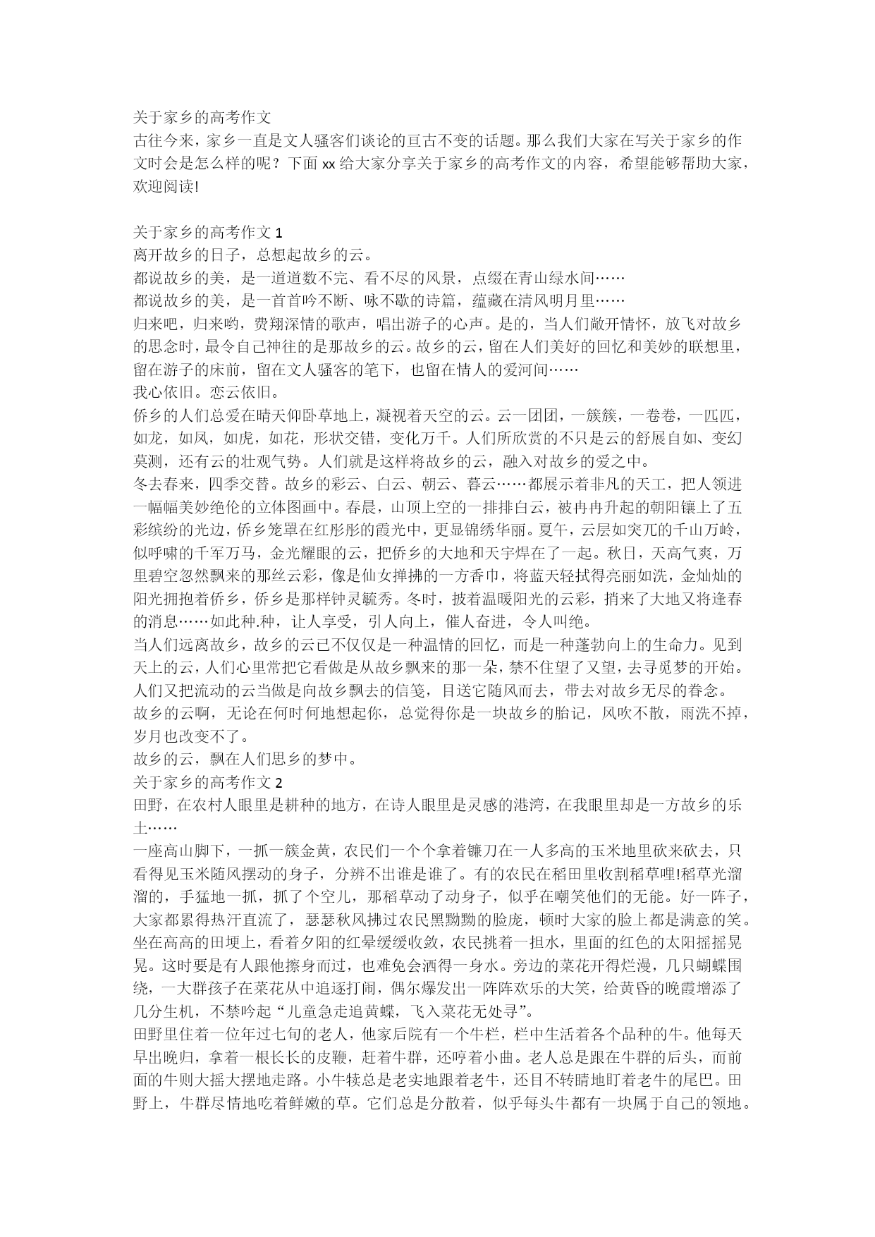 关于家乡的高考作文古往今来,家乡一直是文人骚客们谈论的亘古不变的话题。那么我们大家在写关于家乡的作文时会是怎么样的呢?下面xx给大家分享关于家乡的高考作文的内容,希望能够帮助大家,欢迎阅读!关于家乡的高考作文1离开故乡的日子,总想起故乡的云。都说故乡的美,是一道道数不完、看不尽的风景,点缀在青山绿水间……都说故乡的美,是一首首吟不断、咏不歇的诗篇,蕴藏在清风明月里……归来吧,归来哟,费翔深情的歌声,唱出游子的心声。是的,当人们敞开情怀,放飞对故乡的思念时,最令自己神往的是那故乡的云。故乡的云,留在人们美好