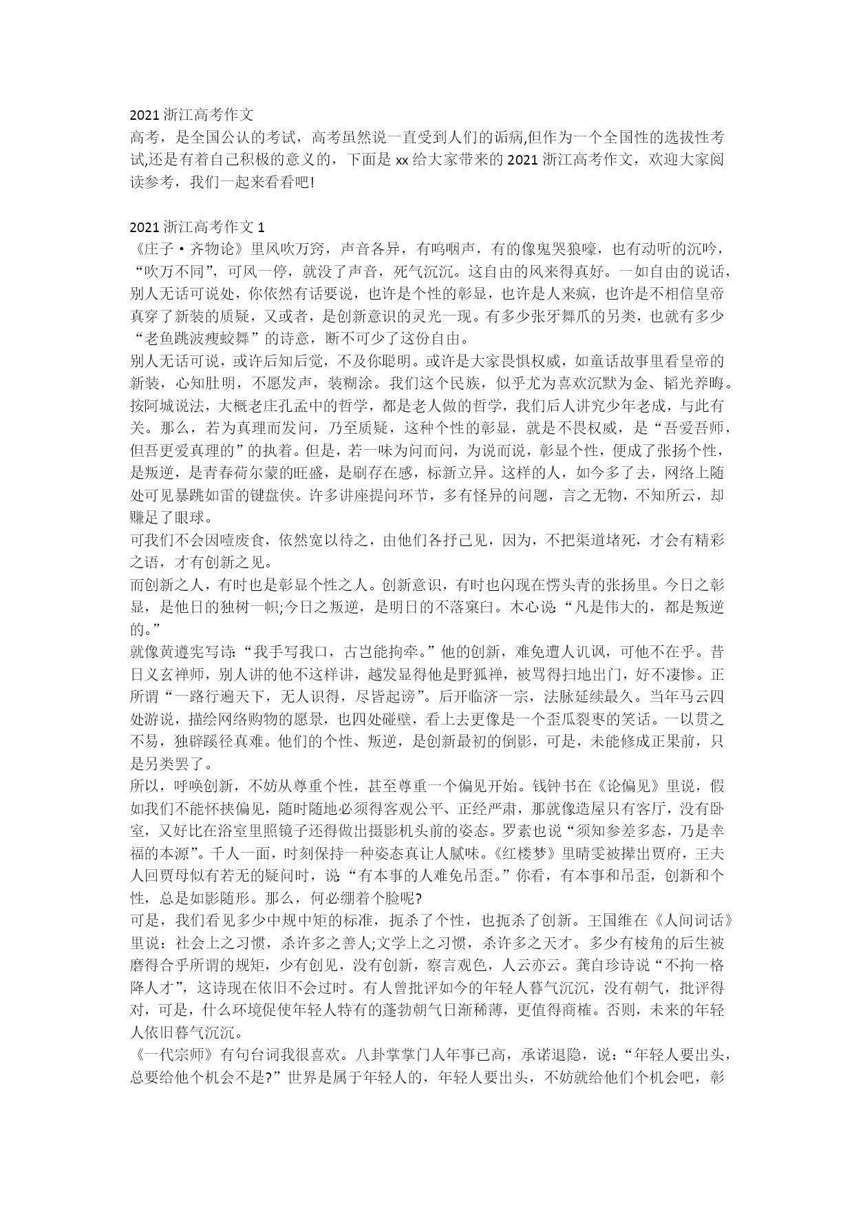 2021浙江高考作文高考,是全国公认的考试,高考虽然说一直受到人们的诟病,但作为一个全国性的选拔性考试,还是有着自己积极的意义的,下面是xx给大家带来的2021浙江高考作文,欢迎大家阅读参考,我们一起来看看吧!2021浙江高考作文1《庄子·齐物论》里风吹万窍,声音各异,有呜咽声,有的像鬼哭狼嚎,也有动听的沉吟,“吹万不同”,可风一停,就没了声音,死气沉沉。这自由的风来得真好。一如自由的说话,别人无话可说处,你依然有话要说,也许是个性的彰显,也许是人来疯,也许是不相信皇帝真穿了新装的质疑,又或者,是创新意识