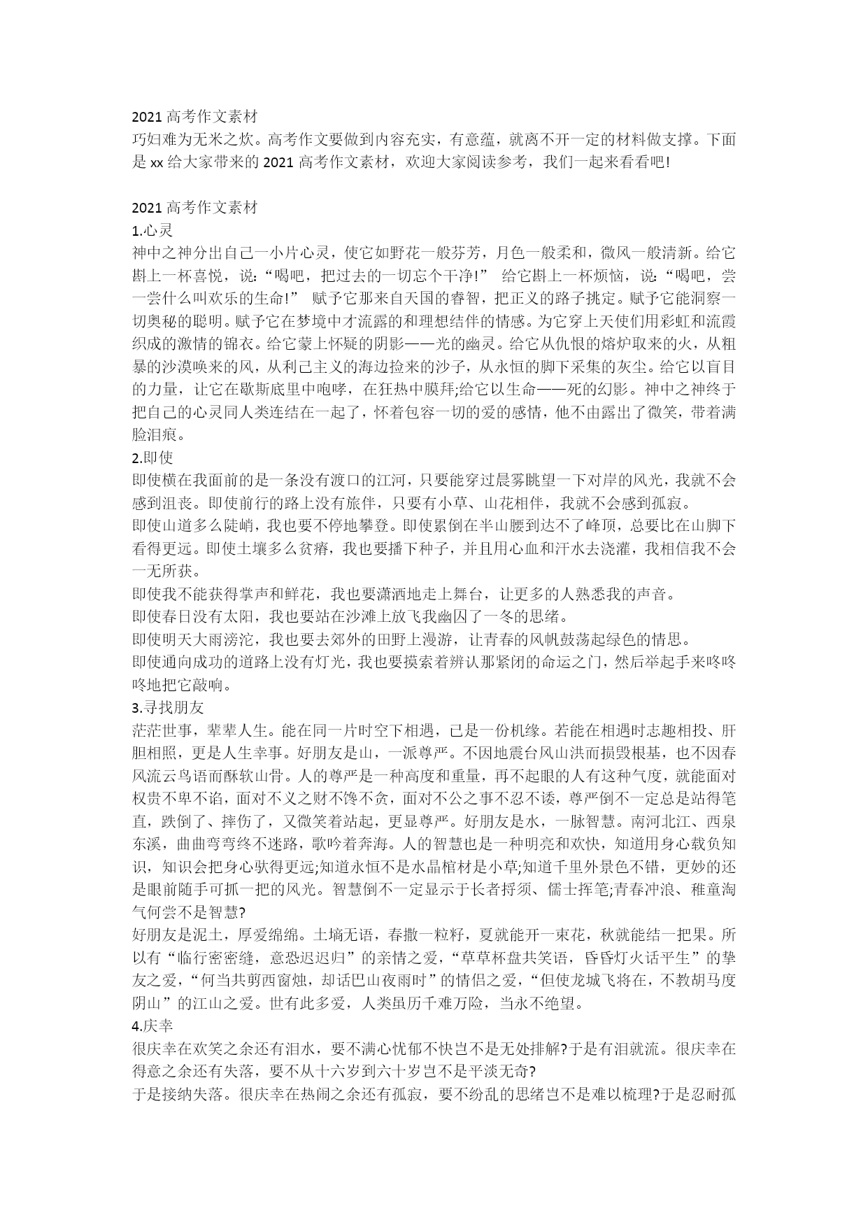 2021高考作文素材巧妇难为无米之炊。高考作文要做到内容充实,有意蕴,就离不开一定的材料做支撑。下面是xx给大家带来的2021高考作文素材,欢迎大家阅读参考,我们一起来看看吧!2021高考作文素材1.心灵神中之神分出自己一小片心灵,使它如野花一般芬芳,月色一般柔和,微风一般清新。给它斟上一杯喜悦,说:“喝吧,把过去的一切忘个干净!”给它斟上一杯烦恼,说:“喝吧,尝一尝什么叫欢乐的生命!”赋予它那来自天国的睿智,把正义的路子挑定。赋予它能洞察一切奥秘的聪明。赋予它在梦境中才流露的和理想结伴的情感。为它穿上天