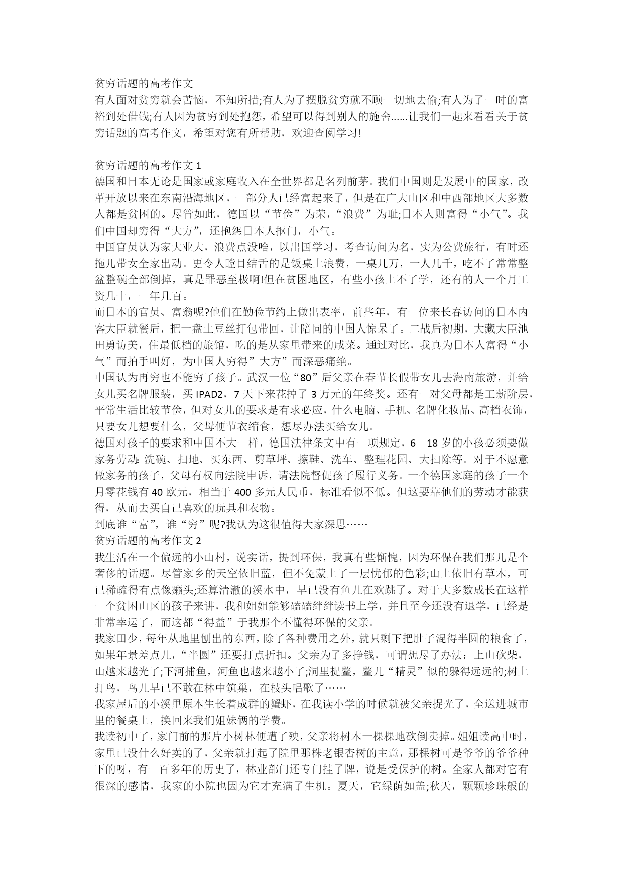 贫穷话题的高考作文有人面对贫穷就会苦恼,不知所措;有人为了摆脱贫穷就不顾一切地去偷;有人为了一时的富裕到处借钱;有人因为贫穷到处抱怨,希望可以得到别人的施舍......让我们一起来看看关于贫穷话题的高考作文,希望对您有所帮助,欢迎查阅学习!贫穷话题的高考作文1德国和日本无论是国家或家庭收入在全世界都是名列前茅。我们中国则是发展中的国家,改革开放以来在东南沿海地区,一部分人已经富起来了,但是在广大山区和中西部地区大多数人都是贫困的。尽管如此,德国以“节俭”为荣,“浪费”为耻;日本人则富得“小气”。我们中国却