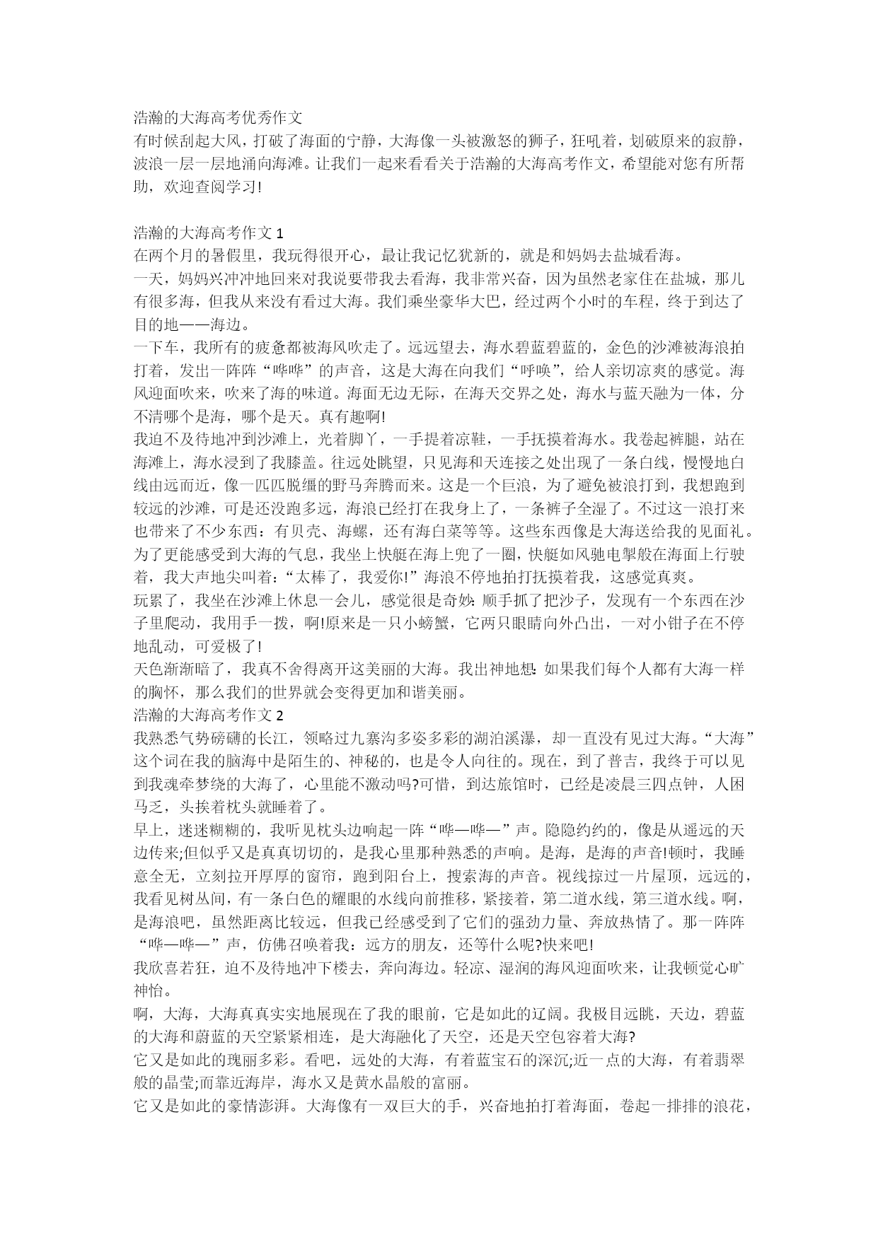 浩瀚的大海高考优秀作文有时候刮起大风,打破了海面的宁静,大海像一头被激怒的狮子,狂吼着,划破原来的寂静,波浪一层一层地涌向海滩。让我们一起来看看关于浩瀚的大海高考作文,希望能对您有所帮助,欢迎查阅学习!浩瀚的大海高考作文1在两个月的暑假里,我玩得很开心,最让我记忆犹新的,就是和妈妈去盐城看海。一天,妈妈兴冲冲地回来对我说要带我去看海,我非常兴奋,因为虽然老家住在盐城,那儿有很多海,但我从来没有看过大海。我们乘坐豪华大巴,经过两个小时的车程,终于到达了目的地——海边。一下车,我所有的疲惫都被海风吹走了。远远