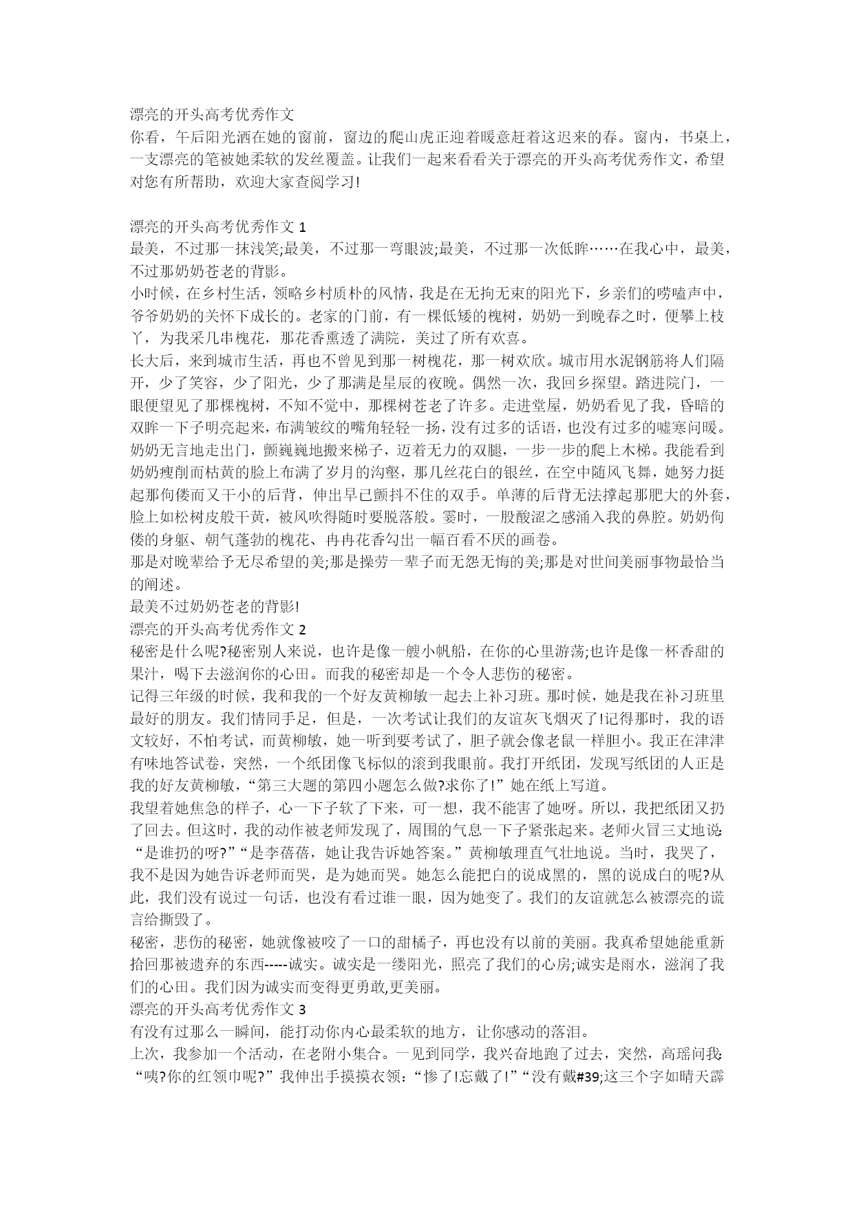 漂亮的开头高考优秀作文你看,午后阳光洒在她的窗前,窗边的爬山虎正迎着暖意赶着这迟来的春。窗内,书桌上,一支漂亮的笔被她柔软的发丝覆盖。让我们一起来看看关于漂亮的开头高考优秀作文,希望对您有所帮助,欢迎大家查阅学习!漂亮的开头高考优秀作文1最美,不过那一抹浅笑;最美,不过那一弯眼波;最美,不过那一次低眸……在我心中,最美,不过那奶奶苍老的背影。小时候,在乡村生活,领略乡村质朴的风情,我是在无拘无束的阳光下,乡亲们的唠嗑声中,爷爷奶奶的关怀下成长的。老家的门前,有一棵低矮的槐树,奶奶一到晚春之时,便攀上枝丫,