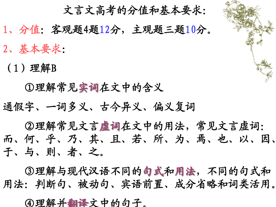 文言文高考的分值和基本要求:1、分值:客观题4题12分,主观题三题10分。2、基本要求:(1)理解B①理解常见实词在文中的含义通假字、一词多义、古今异义、偏义复词②理解常见文言虚词在文中的用法,常见文言虚词:而、何、乎、乃、其、且、若、所、为、焉、也、以、因、于、与、则、者、之。③理解与现代汉语不同的句式和用法,不同的句式和用法:判断句、被动句、宾语前置、成分省略和词类活用。④理解并翻译文中的句子。(2)分析综合C①筛选文中的信息②归纳内容要点,概括中心意思③分析概括作者在文中的观点态度