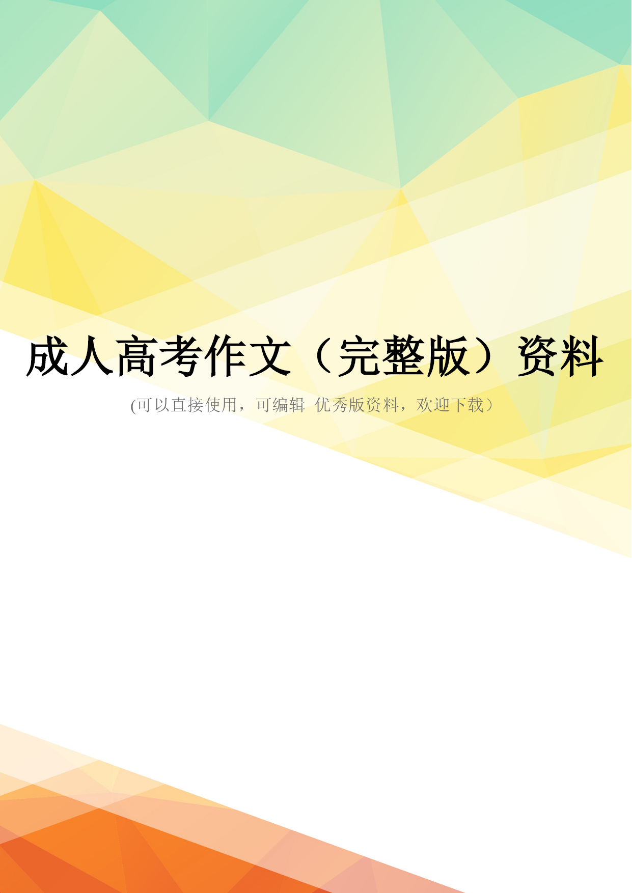 成人高考作文(完整版)资料(可以直接使用,可编辑优秀版资料,欢迎下载)成人高考范文1、假设你是李华,你的澳大利亚朋友Dick听说中国的中小学真该减轻学生的学习负担,来信询问有关情况。请你根据下表提供的信息,写一封回信,谈一谈肩负给你的学习和生活带来的变化。周末活动(减负前)周末活动(减负后)白天:上课、做作业白天:参观博物馆、学习电脑、绘画等晚上:做作业晚上:看新闻、读书、看报就寝时间:11:30就寝时间10:00注意:1、词数100左右;2、开头已为你写好。生词:减轻学习负担-reducelearnin