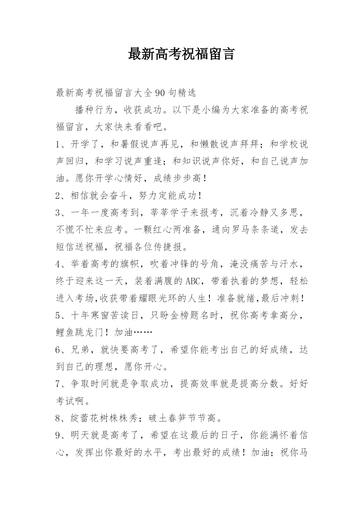 最新高考祝福留言最新高考祝福留言大全90句精选播种行为,收获成功。以下是小编为大家准备的高考祝福留言,大家快来看看吧。1、开学了,和暑假说声再见,和懒散说声拜拜;和学校说声回归,和学习说声重逢;和知识说声你好,和自己说声加油。愿你开学心情好,成绩步步高!2、相信就会奋斗,努力定能成功!3、一年一度高考到,莘莘学子来报考,沉着冷静又多思,不慌不忙来应考。一颗红心两准备,通向罗马条条道,发去短信送祝福,祝福各位传捷报。4、举着高考的旗帜,吹着冲锋的号角,淹没痛苦与汗水,终于迎来这一天,装着满腹的ABC,带着执